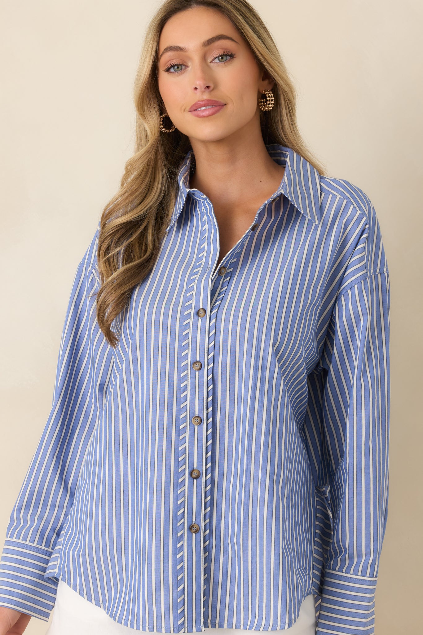 The Just What You Wanted Navy Stripe Cotton Button Up Shirt delivers exactly that. a versatile piece that fits seamlessly into your everyday style. This navy shirt features an ivory stripe pattern. collared neckline. functional button front. long sleeves. button cuffs. relaxed fit. and scoop bottom hem.