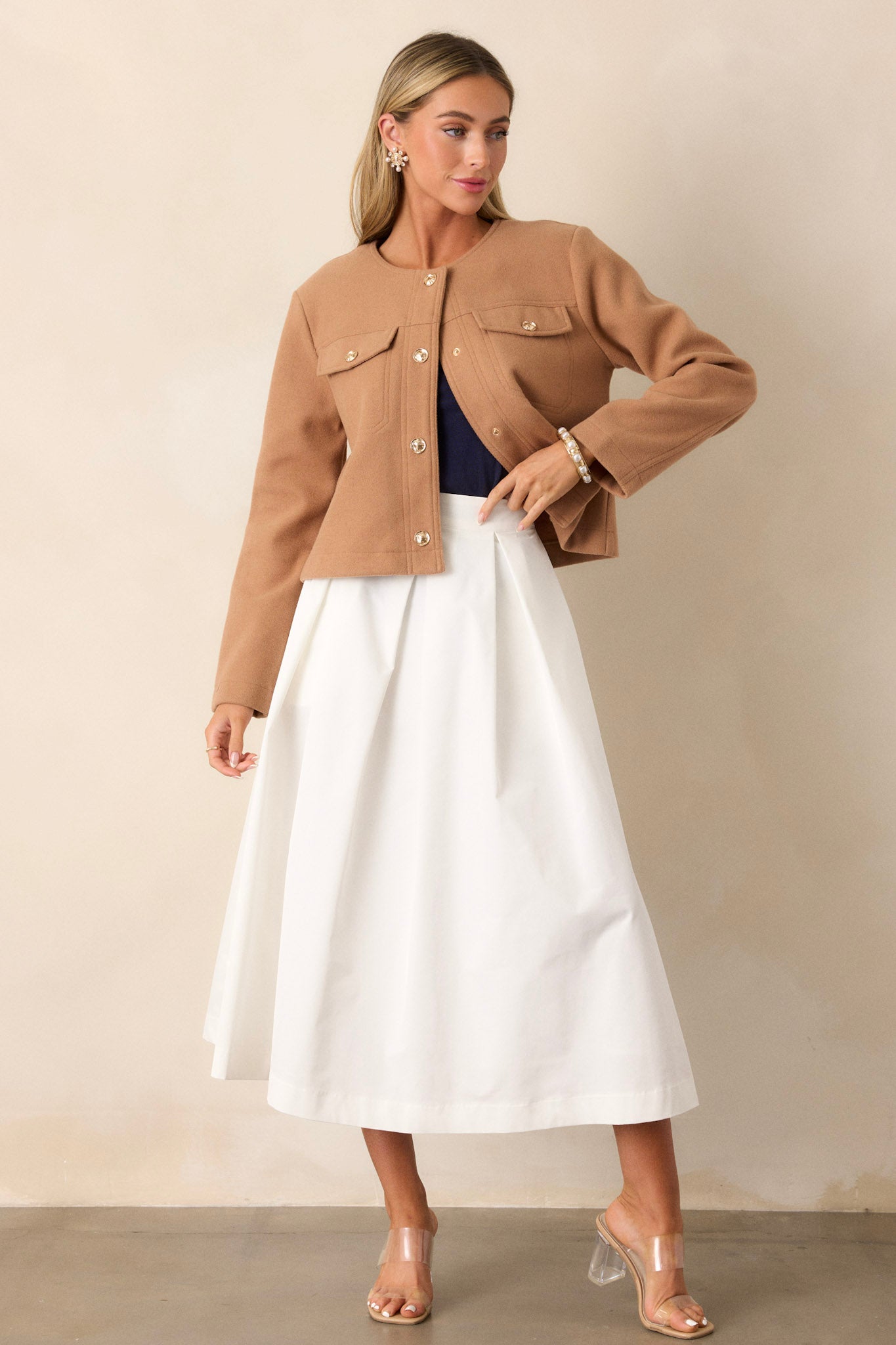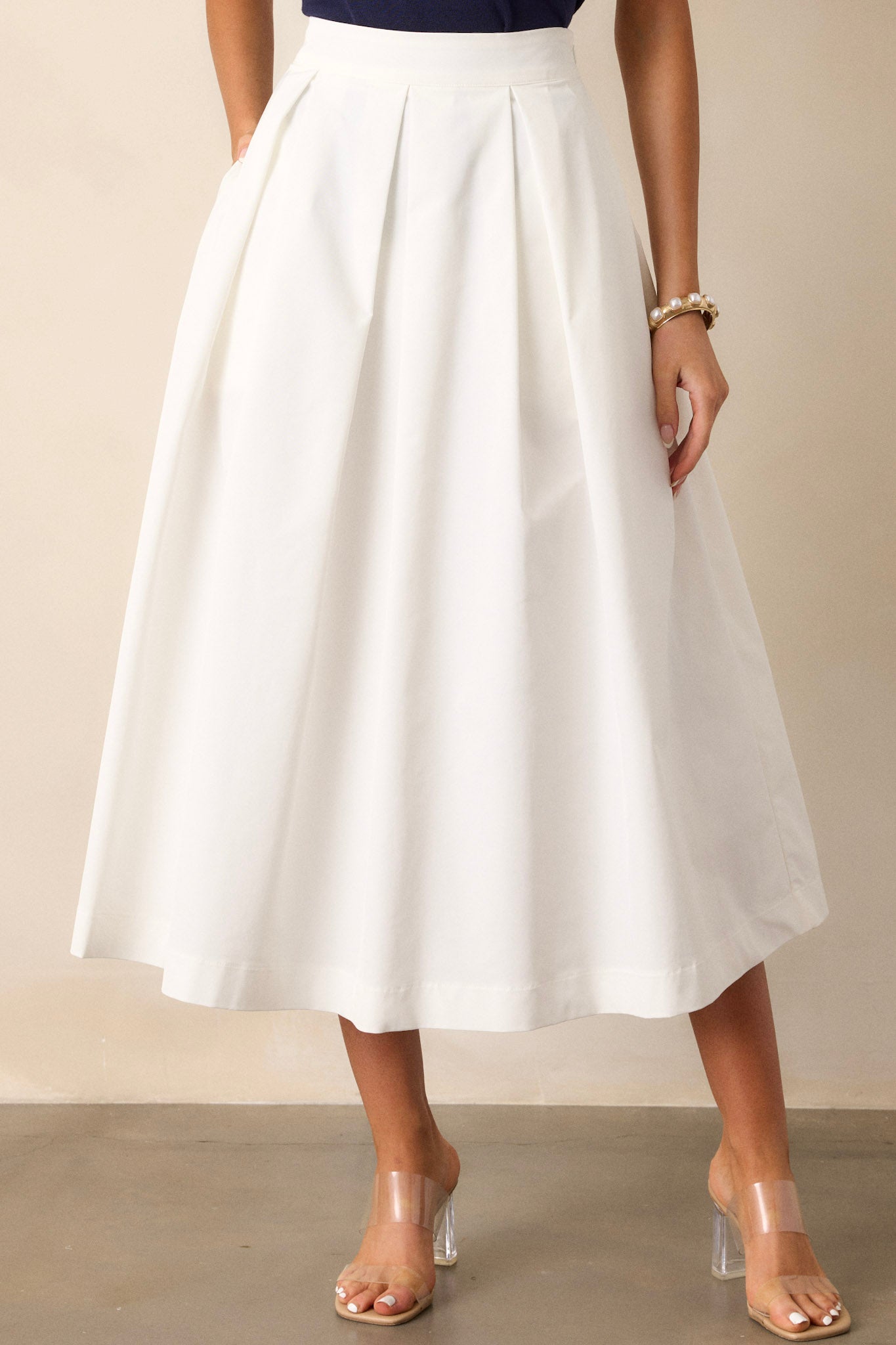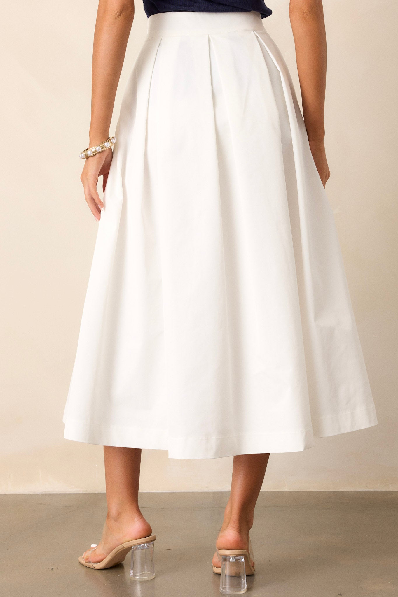 Capture nostalgia with the Memories in Focus White Midi Skirt. Featuring a modern twist on a classic design. this skirt is perfect for adding a touch of retro charm to any outfit. With its versatile midi length. it offers both style and comfort. making it a must-have addition to your wardrobe. This white midi skirt features a high waisted design. a discrete side zipper. a thick waistline. and functional hip pockets.