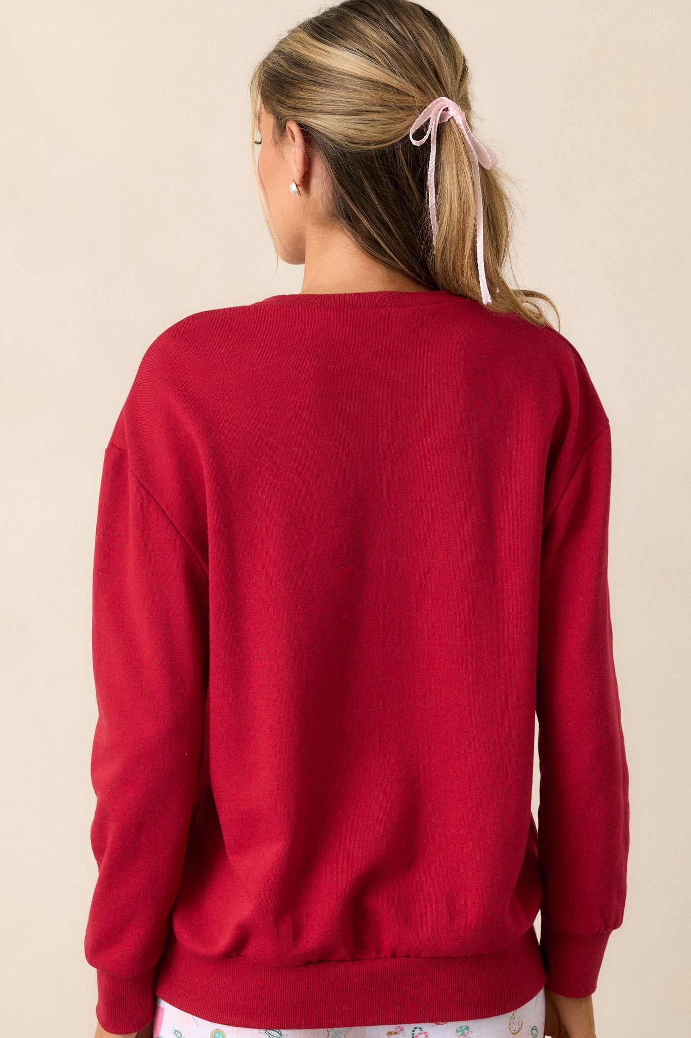 Stay cozy and stylish in our Merry Melodies Red Sweatshirt. Made with soft. high-quality material. this sweatshirt features a bold red color and a classic crew neck design. Perfect for chilly days or casual outings. it's a versatile addition to any wardrobe. Show off your holiday spirit and spread some cheer this season! This red sweatshirt features a ribbed crew neckline. relaxed fit. "Merry" detailing and long sleeves with ribbed hems.