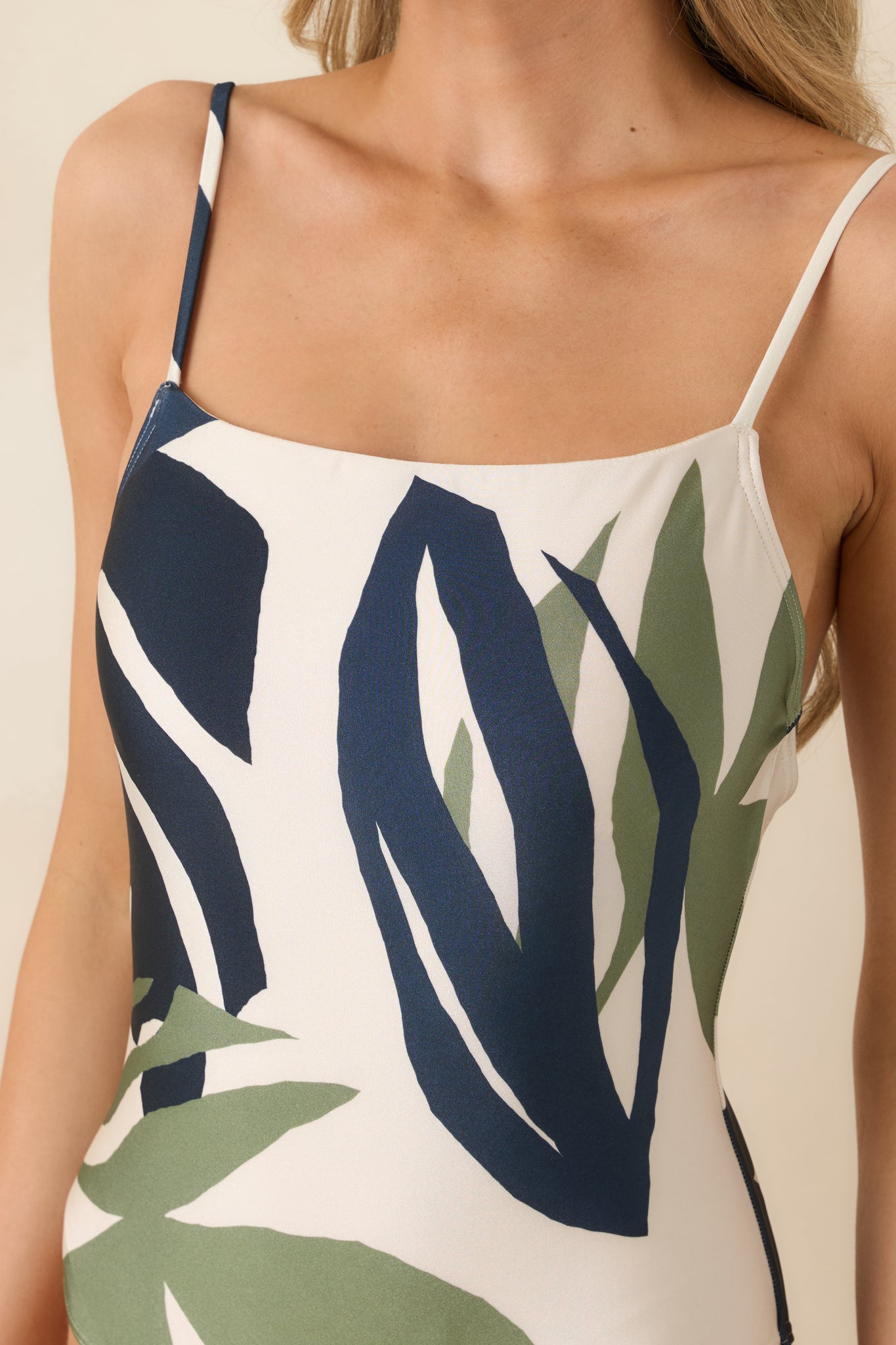 Make waves in the MINKPINK Azure Palm Leaves Scoop Back One Piece. Designed in a dreamy mix of azure blue. soft green. and ivory. this tropical print swimsuit features a flattering square neckline in front and a stunning open scoop back with delicate strap detailing and adjustable tie closure. The sleek silhouette hugs comfortably while offering confident coverage. making it perfect for sun-soaked beach days or poolside lounging with a statement.