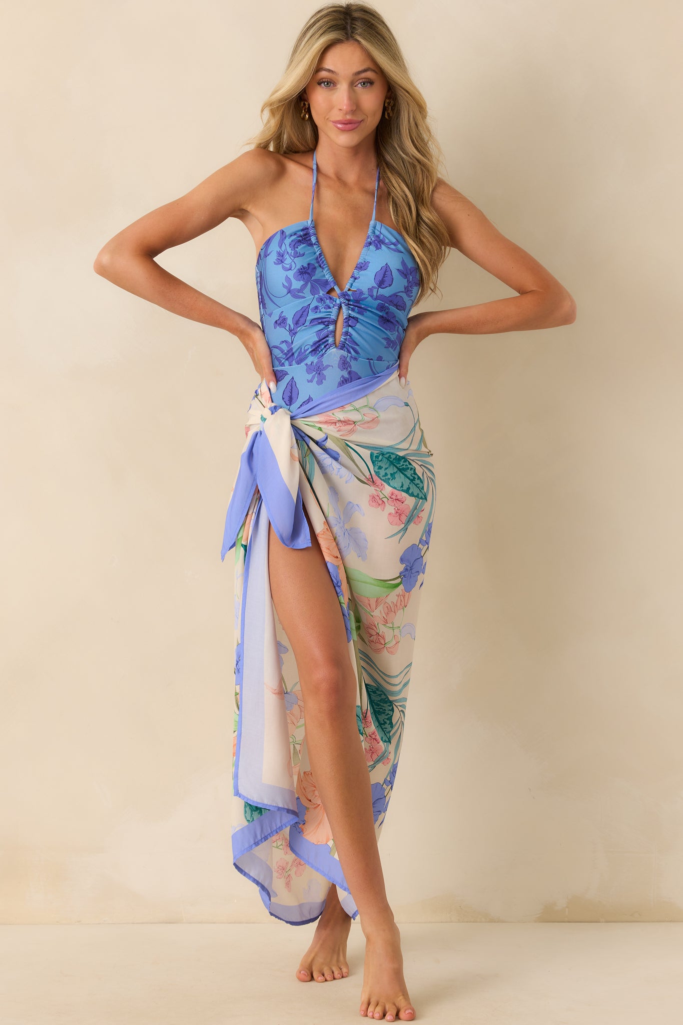 The MINKPINK Blue Floral Print Jeanne Keyhole One Piece Swimsuit is made for sun-soaked days that stretch on and on. Whether you're poolside. beach bound. or relaxing in the shade. it brings a fresh. feminine touch to every moment under the sun. This blue one piece swimsuit features an indigo floral print. adjustable plunging v-neckline. ruched front cutout details. an open back design. self-tie center back bow. and medium coverage bottom.