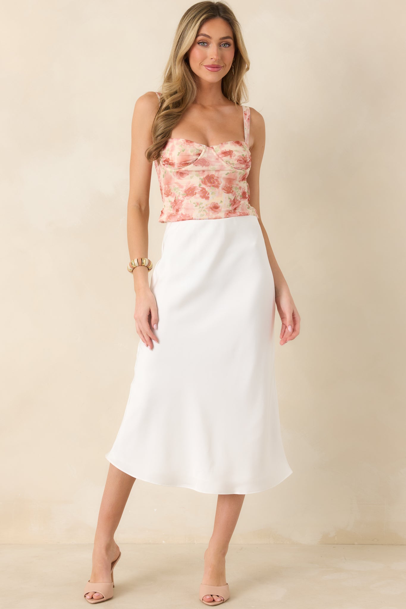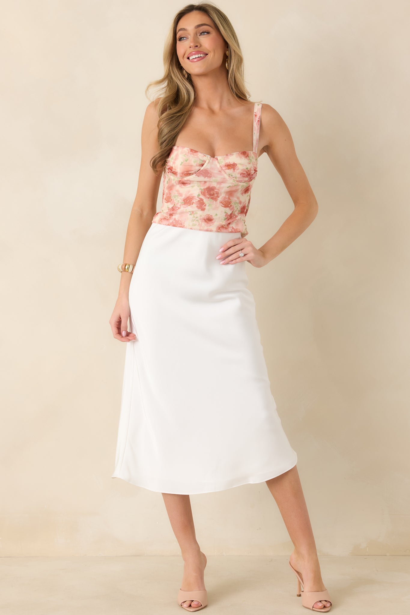 Romantic with a modern edge. the MINKPINK Camille Pink Floral Mesh Bustier is the definition of soft statement dressing. Designed in a delicate rose print over sheer mesh. this fitted silhouette blends vintage-inspired femininity with contemporary allure. Whether styled solo for date night or layered under a cardigan for a sweet daytime look. it's effortlessly captivating. Crafted in a lightweight stretch mesh fabrication. this pink bustier features structured underwire-style seaming with a softly contoured sweetheart neckline for a flattering. supportive fit. Slim adjustable straps and a fitted bodice enhance shape. while the semi-sheer floral overlay adds dimension and texture. Designed to sit at the natural waist. it pairs seamlessly with high-rise skirts or tailored bottoms.
