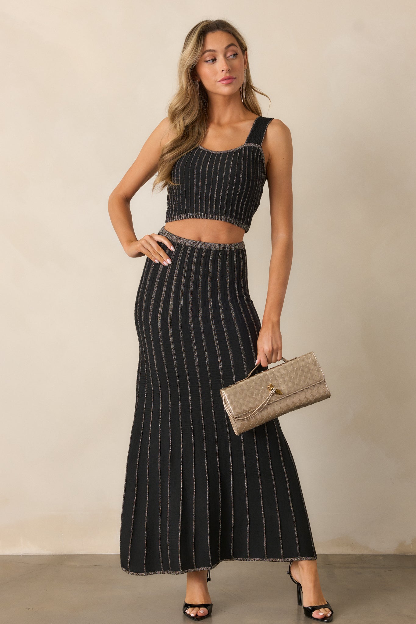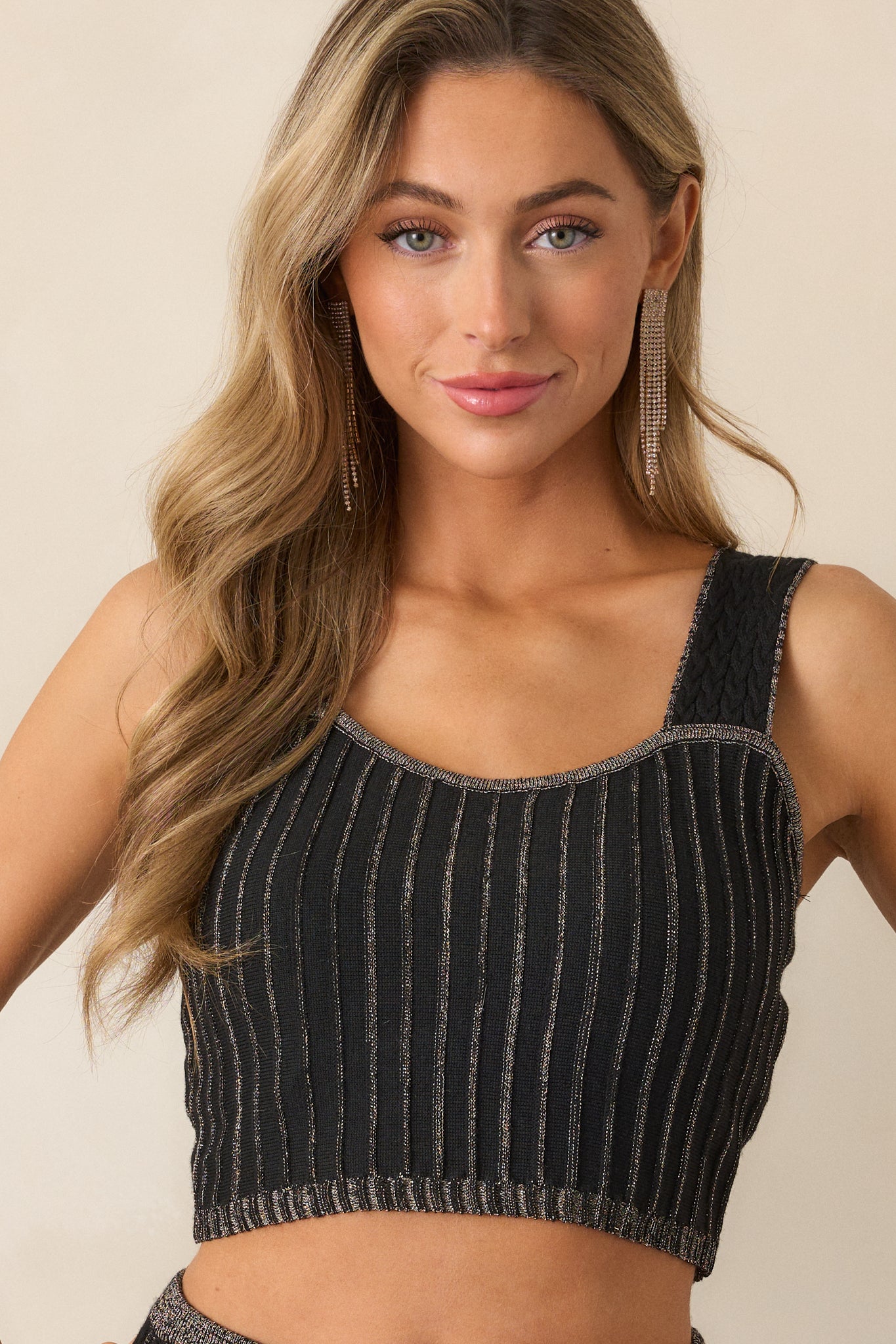Elevate your style with the MINKPINK Celia Lurex Black Stripe Crop Top! This top boasts a trendy black and champagne striped design. perfect for adding sparkle to any outfit. Its crop length and fitted silhouette flatter your figure. while the soft fabric provides all-day comfort. Stand out from the crowd with this must-have piece! This black crop top features a slight scoop neckline. champagne tinsel stripe detailing. a knit material. and wide braided shoulder straps.