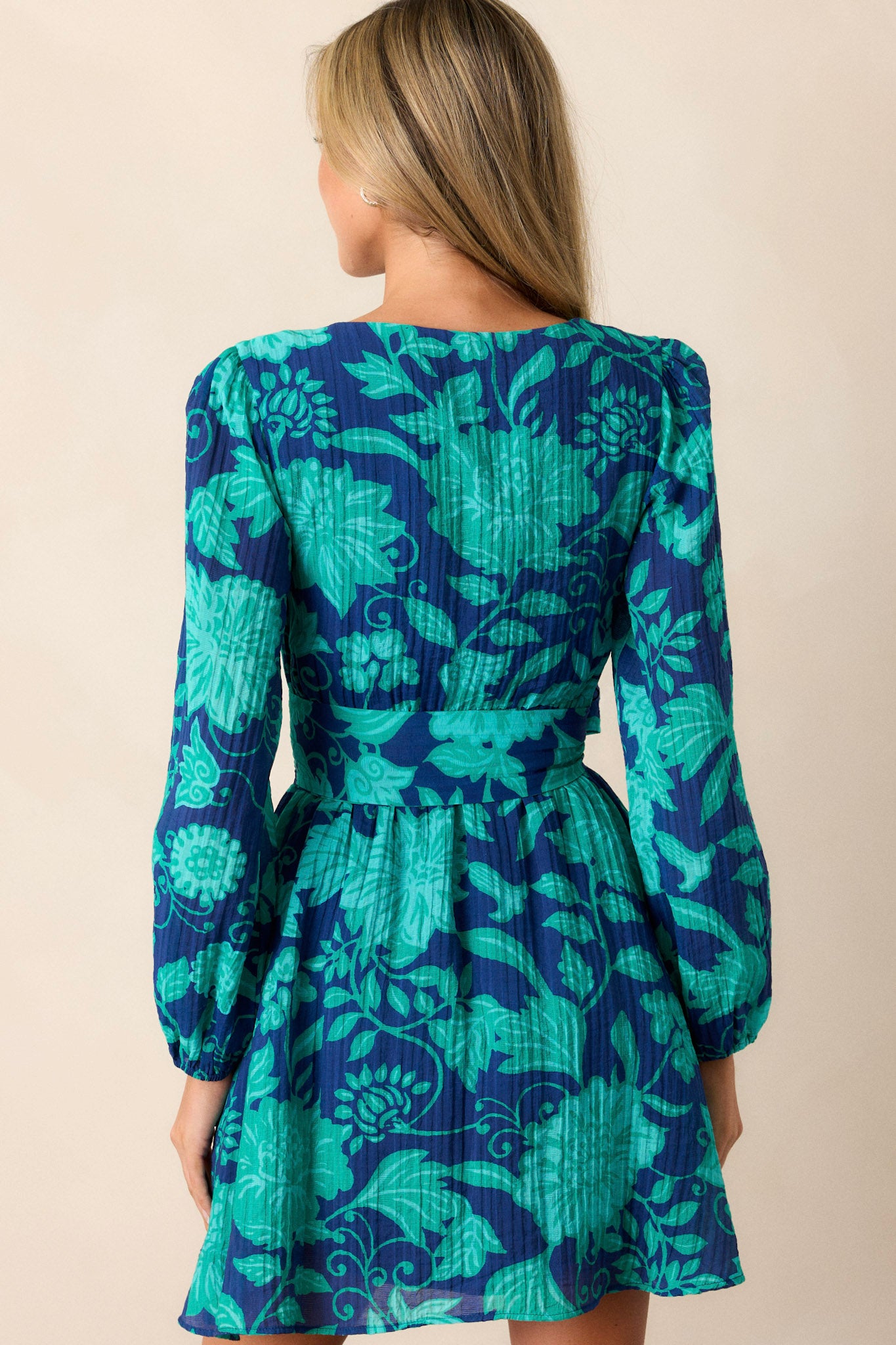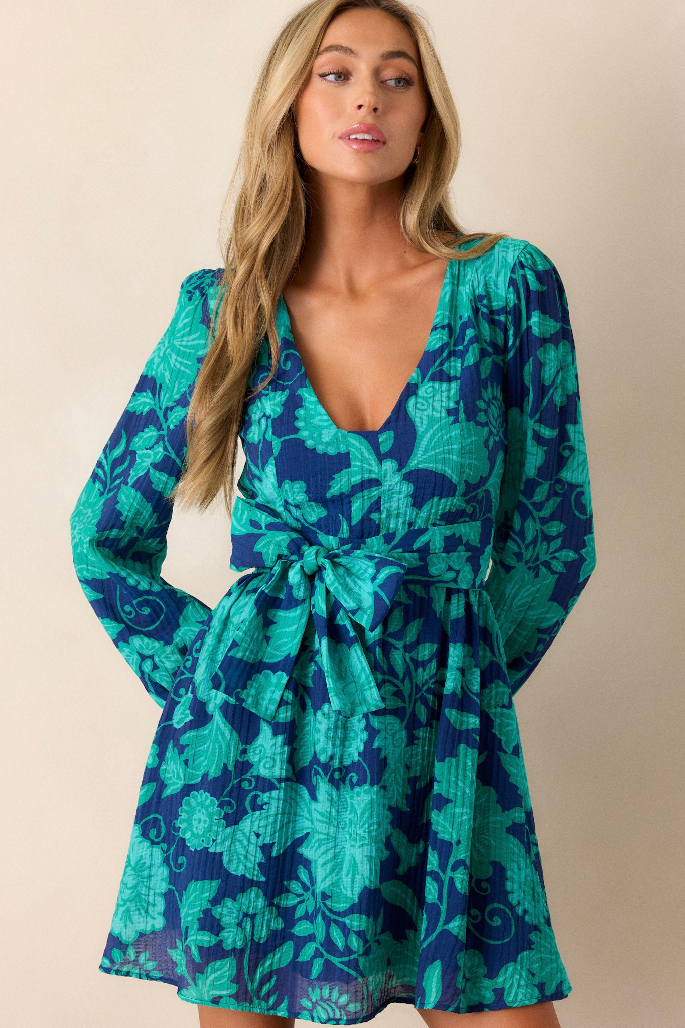 Stay effortlessly stylish with the MINKPINK Connie Navy Floral Mini Dress. Its long sleeves and mini-length design are perfect for any occasion. The dress. featuring a beautiful navy floral pattern. is sure to turn heads. Elevate your look and feel confident all day long. This navy dress features a v-neckline. a bright teal floral pattern. a thick self-tie waist belt. a flowing skirt and elastic cuffed long sleeves.
