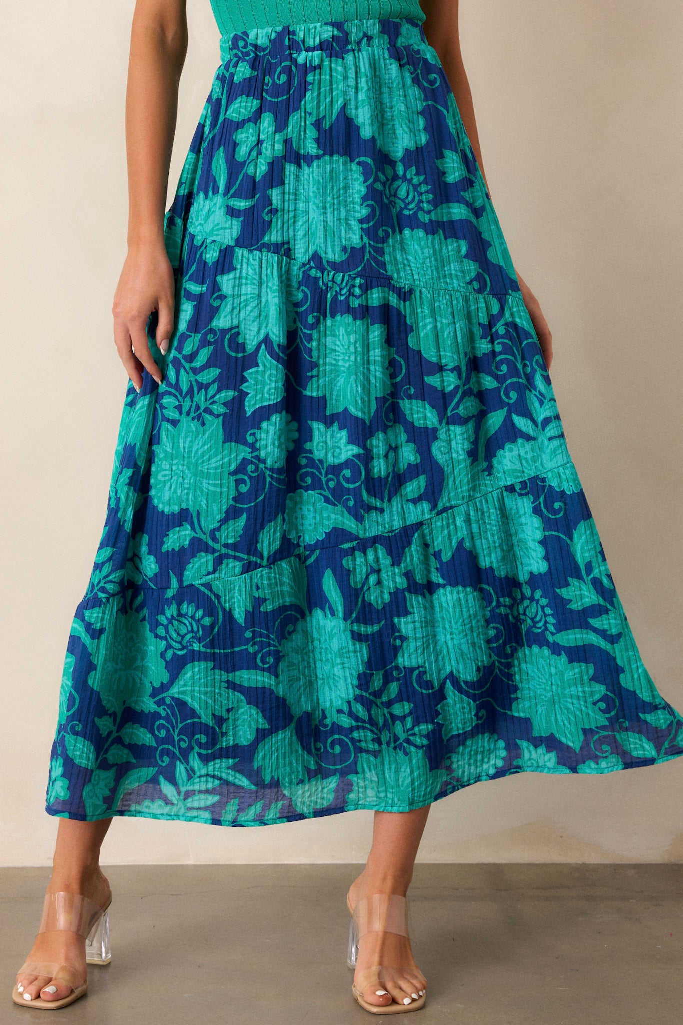 Elevate your wardrobe with the MINKPINK Connie Navy Tiered Midi Skirt. Made with high-quality materials. this skirt offers comfort and style. The tiered design adds a touch of playfulness while the midi length makes it versatile for any occasion. Perfect for those who appreciate quality and a fun twist on a classic silhouette. This navy skirt features an elastic waistband. a textured gauze fabric. green floral pattern. and an asymmetrical tiered design.