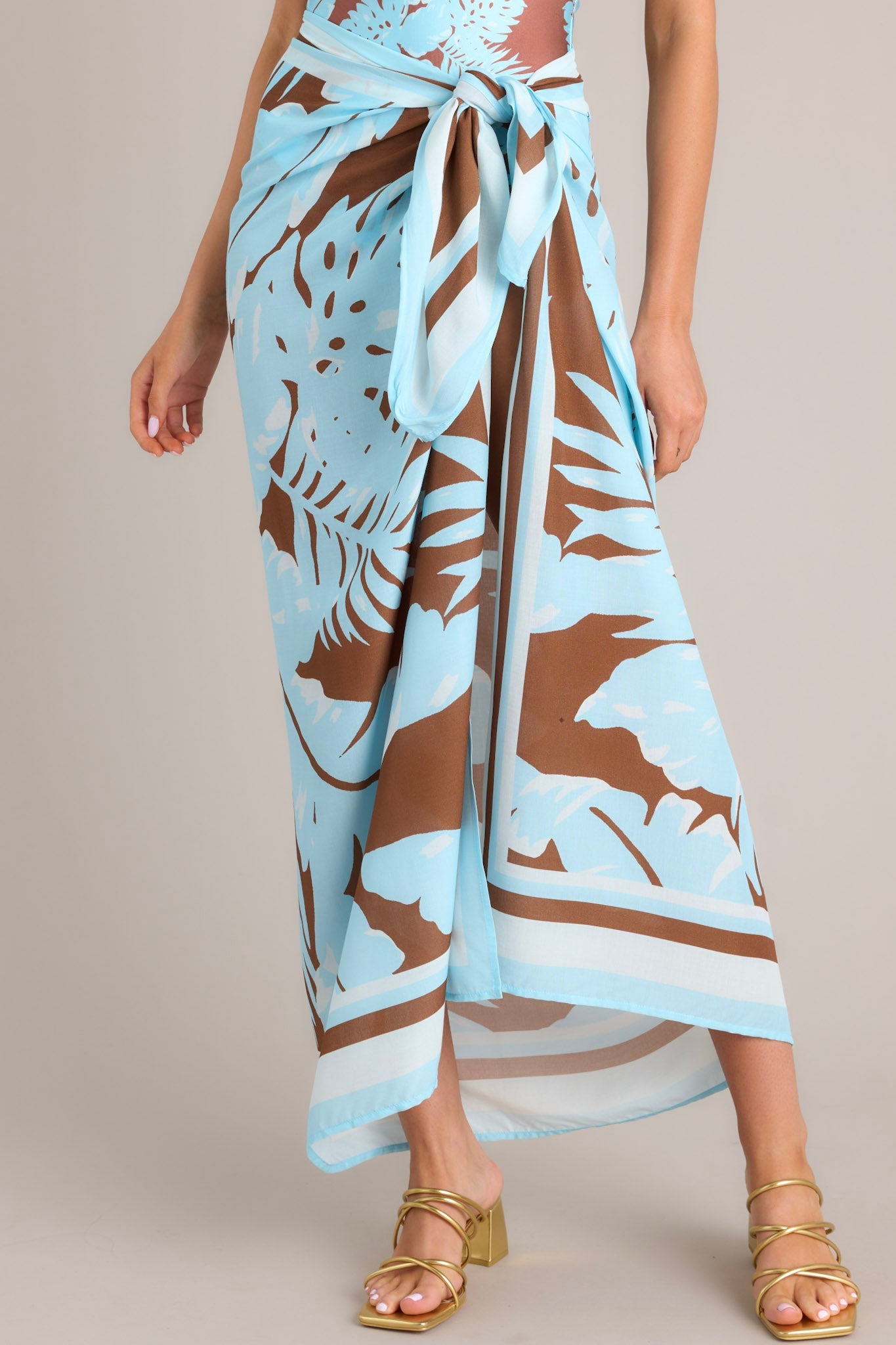 Elevate your beach look with the MINKPINK Tiki Light Blue & Brown Sarong. Lightweight and stylish. this sarong offers versatile coverage and a pop of color to any swimsuit. Perfect for a day in the sun or a tropical getaway. This sarong features a tropical design and a silky fabric.