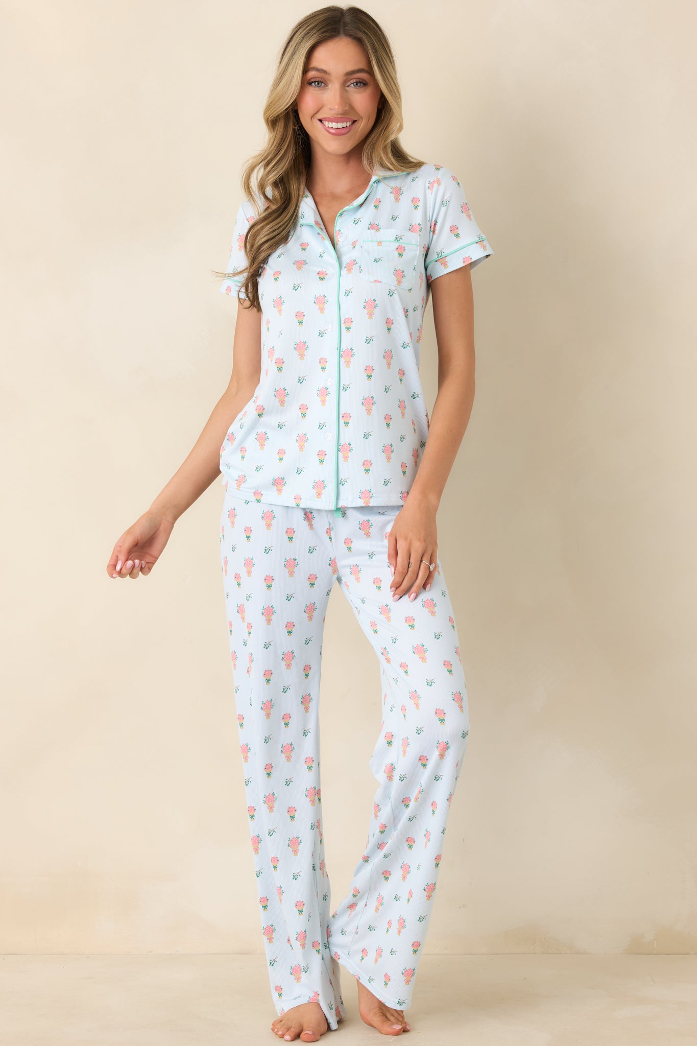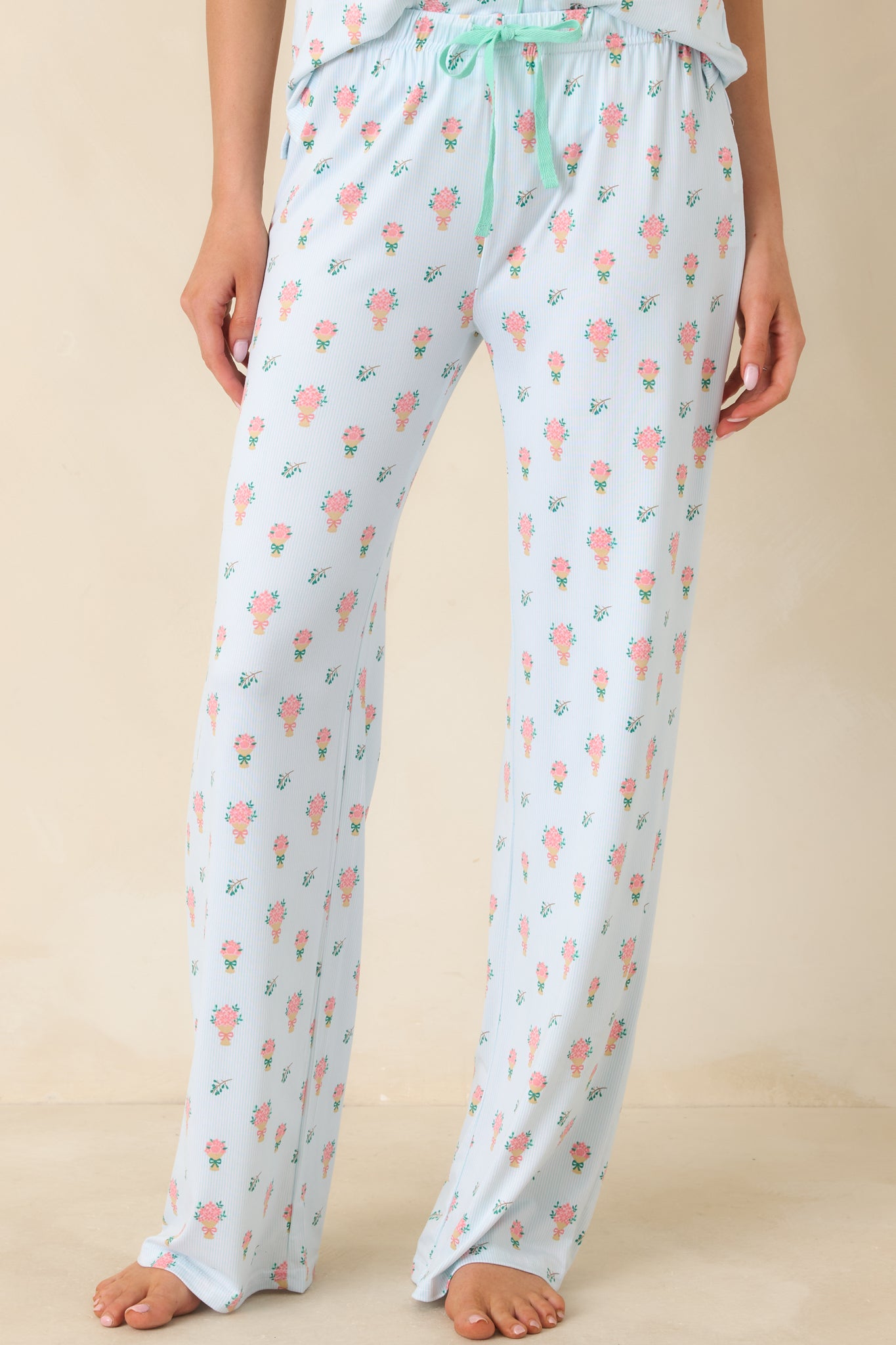The Mint to Be Mine Mint Green Multi Floral Pajama Pants are made for slow mornings and soft landings at the end of the day. Designed with delicate light green stripe base and an allover petite floral bouquet print. they bring a fresh. feminine touch to your lounge lineup. The relaxed silhouette drapes effortlessly. while the elastic waistband with adjustable drawstring ensures a comfortable. customizable fit. Lightweight and breathable. these pajama pants move with you whether you're winding down. sipping coffee. or enjoying a cozy night in. Pair them with the matching top for a perfectly polished pajama set.