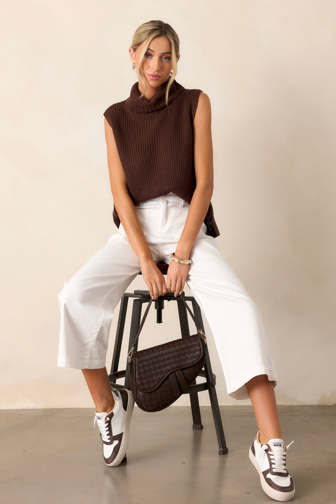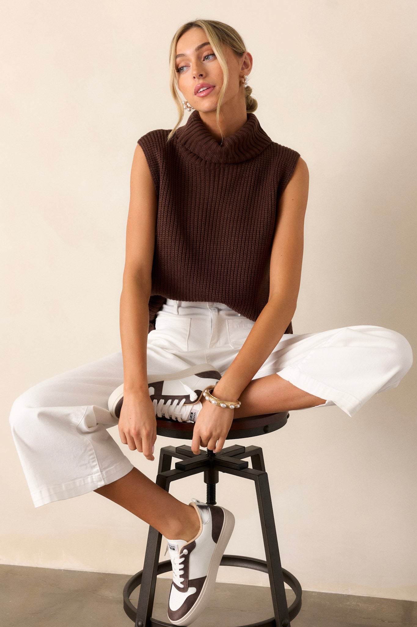Stay warm and stylish with our Mixed Emotions Brown Turtleneck Sweater Vest! Made with soft. high-quality fabric. this vest is perfect for layering and adding a unique touch to your outfit. Embrace your playful side with the quirky word play in the name. while staying cozy and comfortable. This brown sweater features a turtleneck. a ribbed texture. multiple buttons on side. and a sleeveless design.