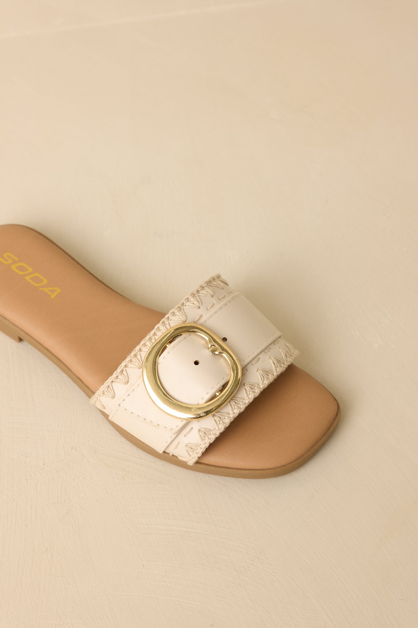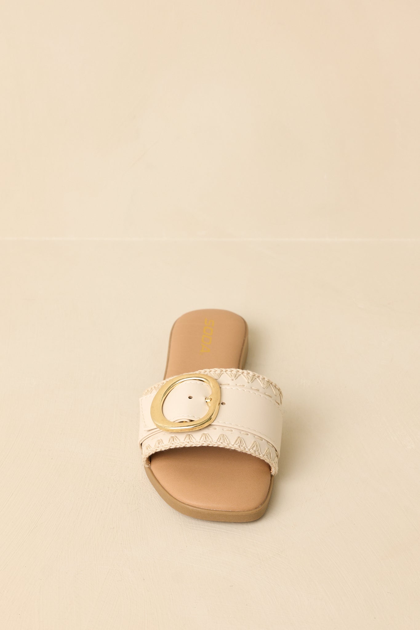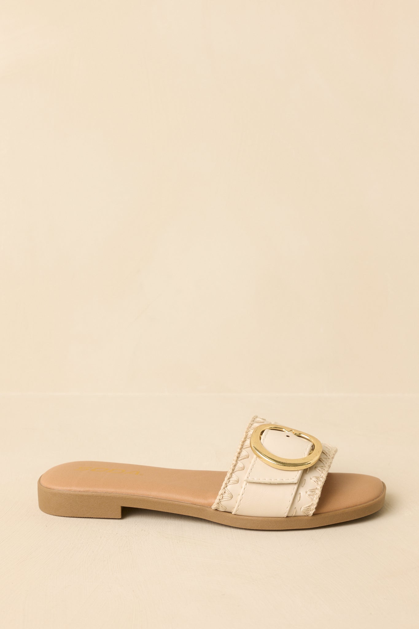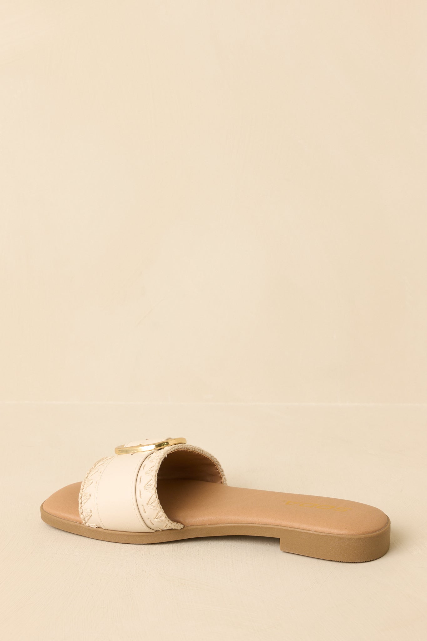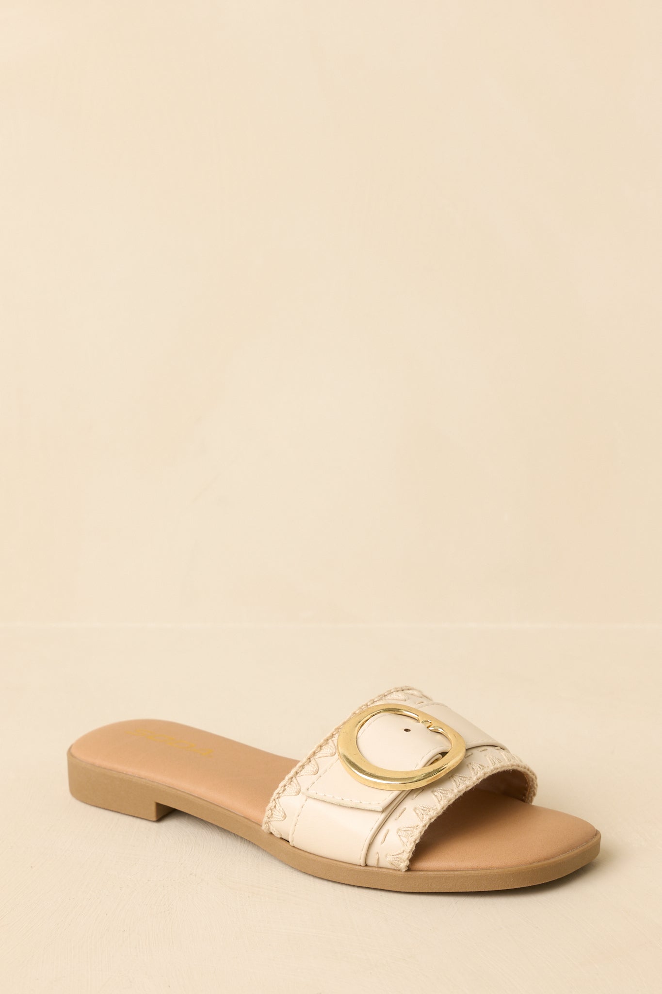 Easygoing with a polished touch. the New Adventures Beige Faux Leather Buckle Strap Slide Sandals are made for days that unfold as you go. A smooth faux leather strap is finished with a statement gold buckle. blending everyday comfort with just enough shine. Slip them on and head out—these are the kind of sandals that go wherever the day leads. This beige faux leather slide sandal features a wide strap with a gold-tone buckle accent. an open-toe design. and a flat sole for all-day comfort. Finished with an easy slip-on fit and a smooth footbed for effortless wear.
