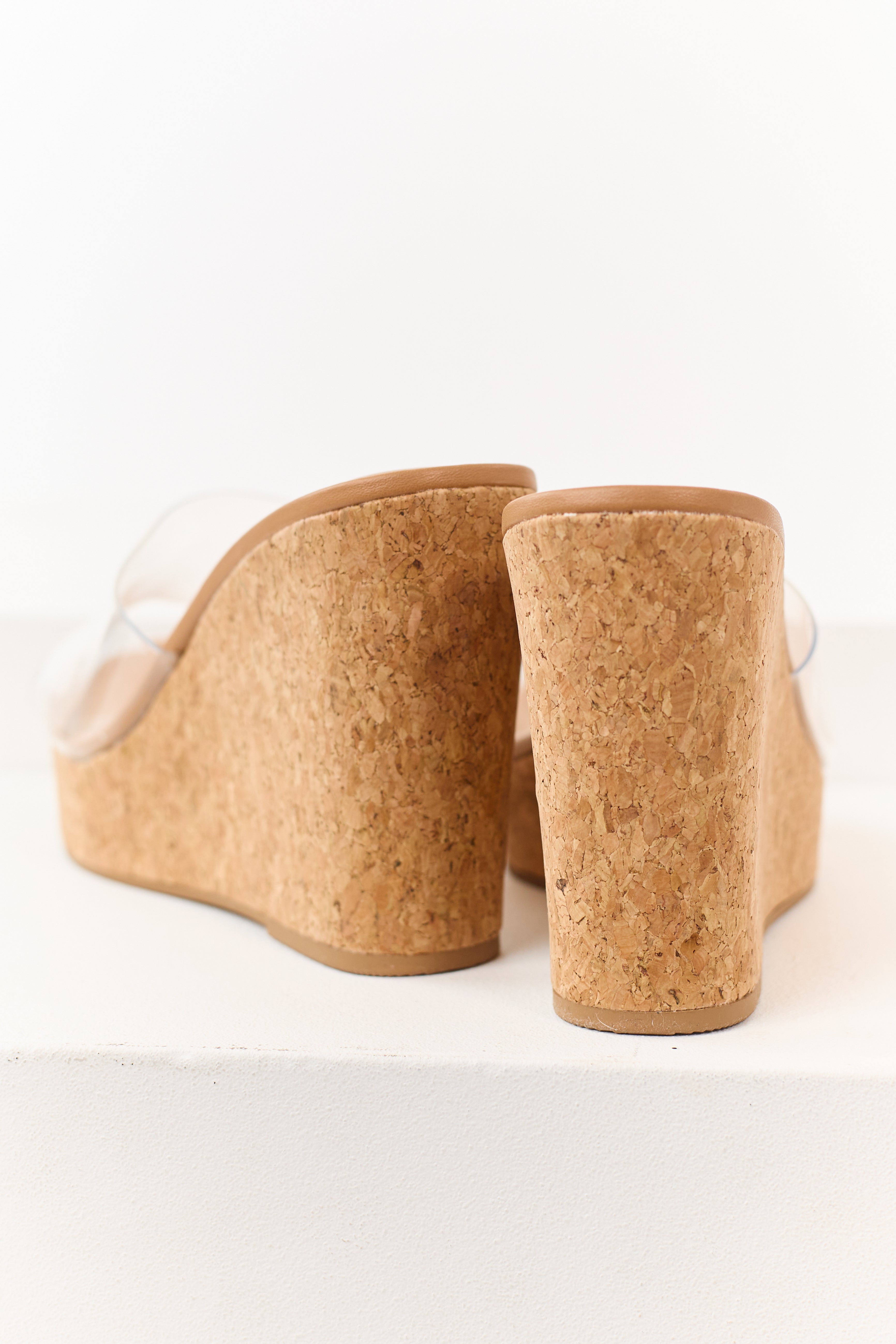 Nude Square Toe Clear Strap Cork Wedges