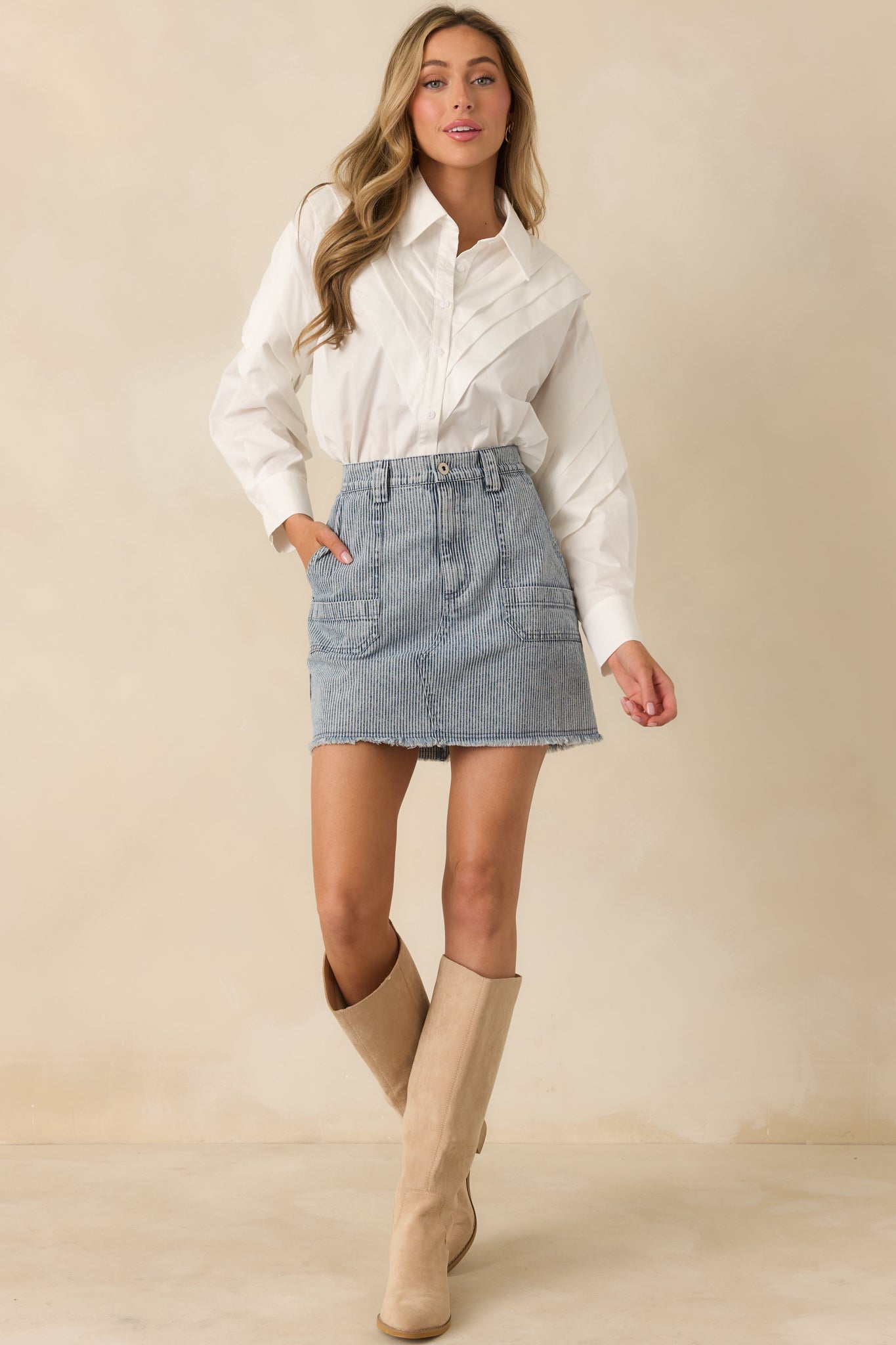 The Off the Beaten Path Distressed Blue Stripe Cotton Denim Mini Skirt is your go-to for relaxed days that still feel put-together. The subtle blue pinstripe adds just enough interest while keeping things classic and easy to style. Finished with a clean mini length and practical pockets. it's the kind of skirt you'll reach for with crisp button-downs. simple knits. and everything in between. This blue stripe mini skirt is made from a structured cotton denim fabric and features a high-rise fit with belt loops. a front button and zipper closure. and functional front and back pockets. Designed with utility-style patch pockets and a raw hemline for a casual finish.
