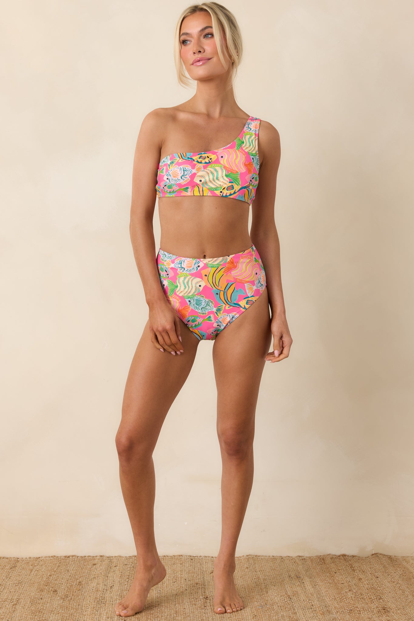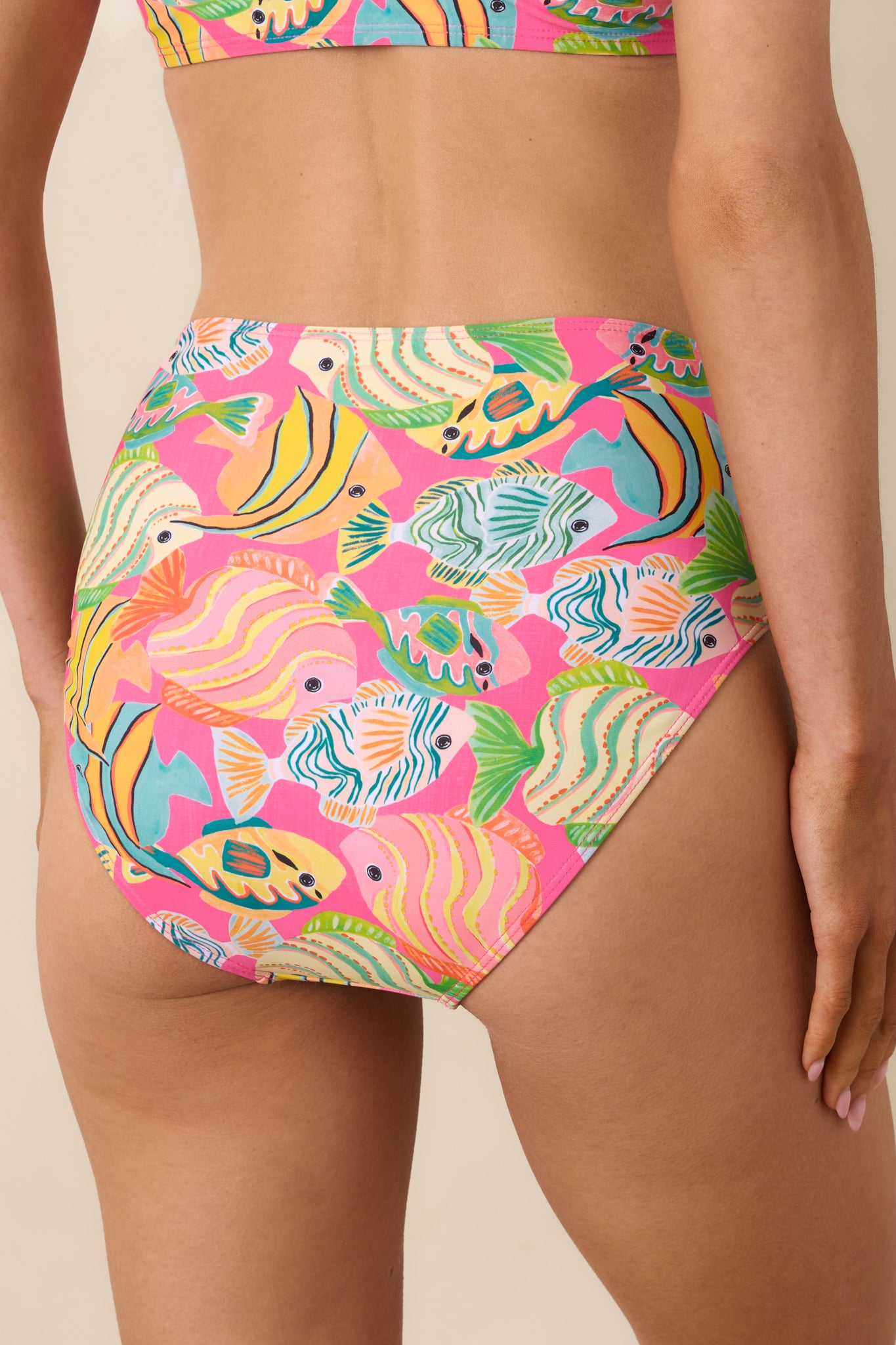Bright. playful. and perfect for poolside days. the Paradisa Breezie Pink Multi Fish Print High Waisted Bikini Bottoms bring a fun tropical feel to your swim collection. The vibrant pink backdrop is covered in colorful fish and ocean-inspired details. creating a lively resort-ready look. Designed with a flattering high-waisted fit. these bottoms offer comfortable coverage while keeping the silhouette sleek and stylish for beach days. boat trips. and sunny getaways.