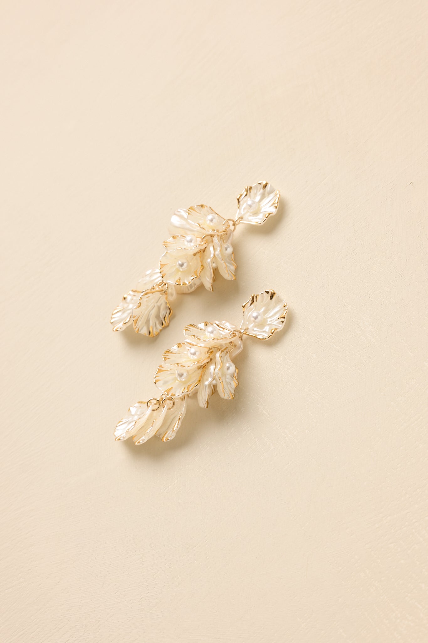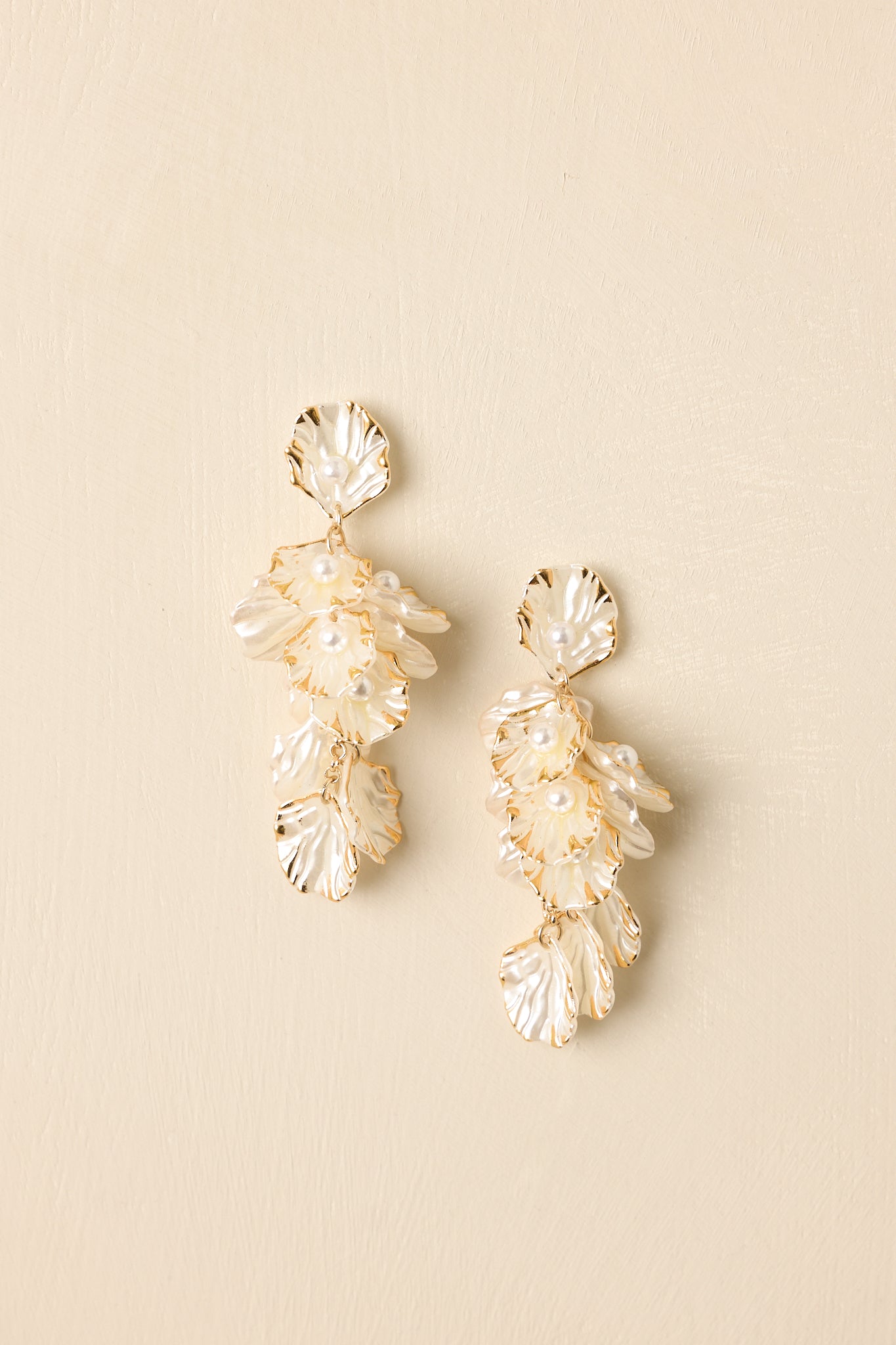 class="lozad" The Petals of the Sea Pearlescent Statement Drop Earrings bring graceful movement and luminous texture to any look. Designed with sculpted pearlescent shell-like petals trimmed in gold. these earrings feature delicate chain connections that create a layered cascading silhouette. Tiny pearl accents nestled among the petals add a soft. elegant finish. making them the perfect statement accessory for special occasions. vacations. or elevated everyday styling.