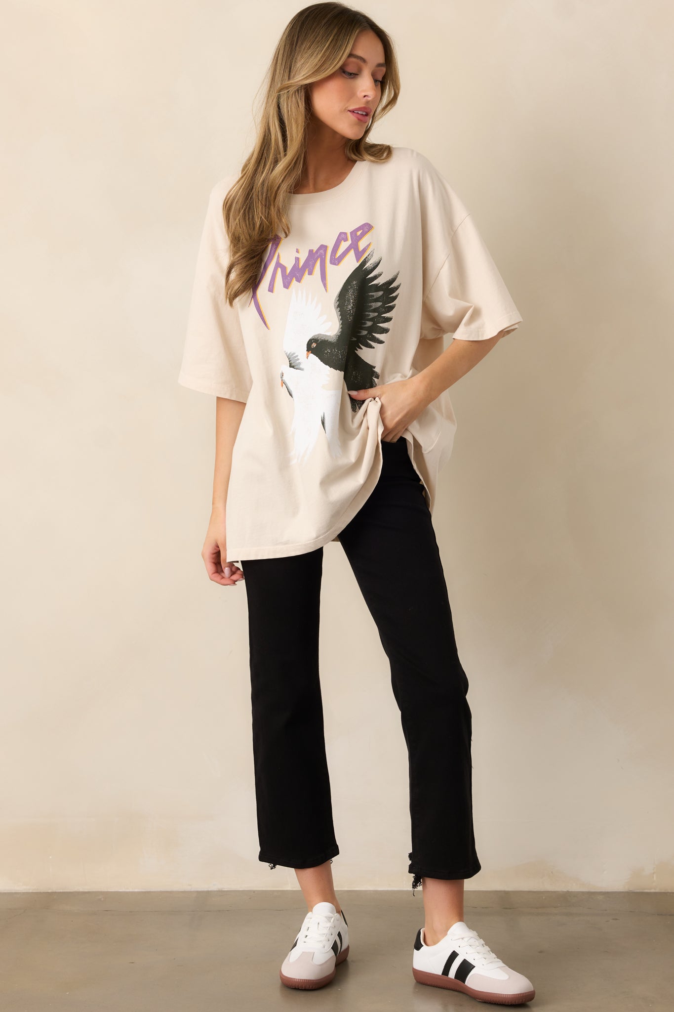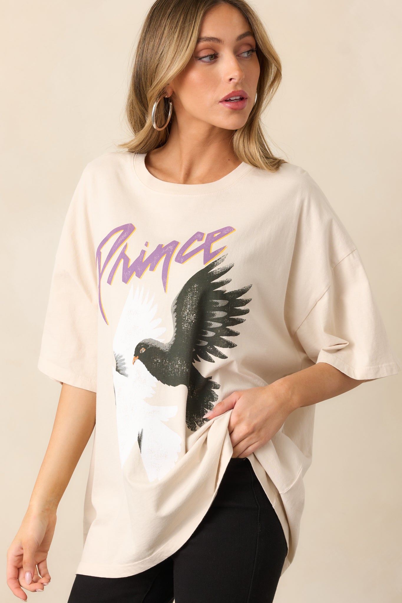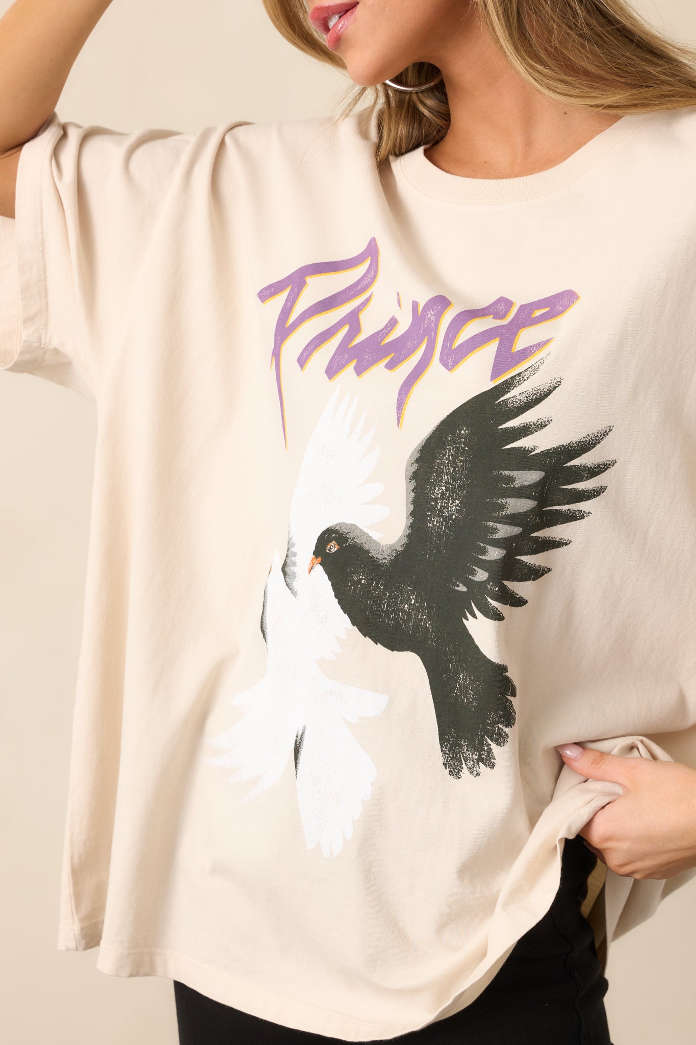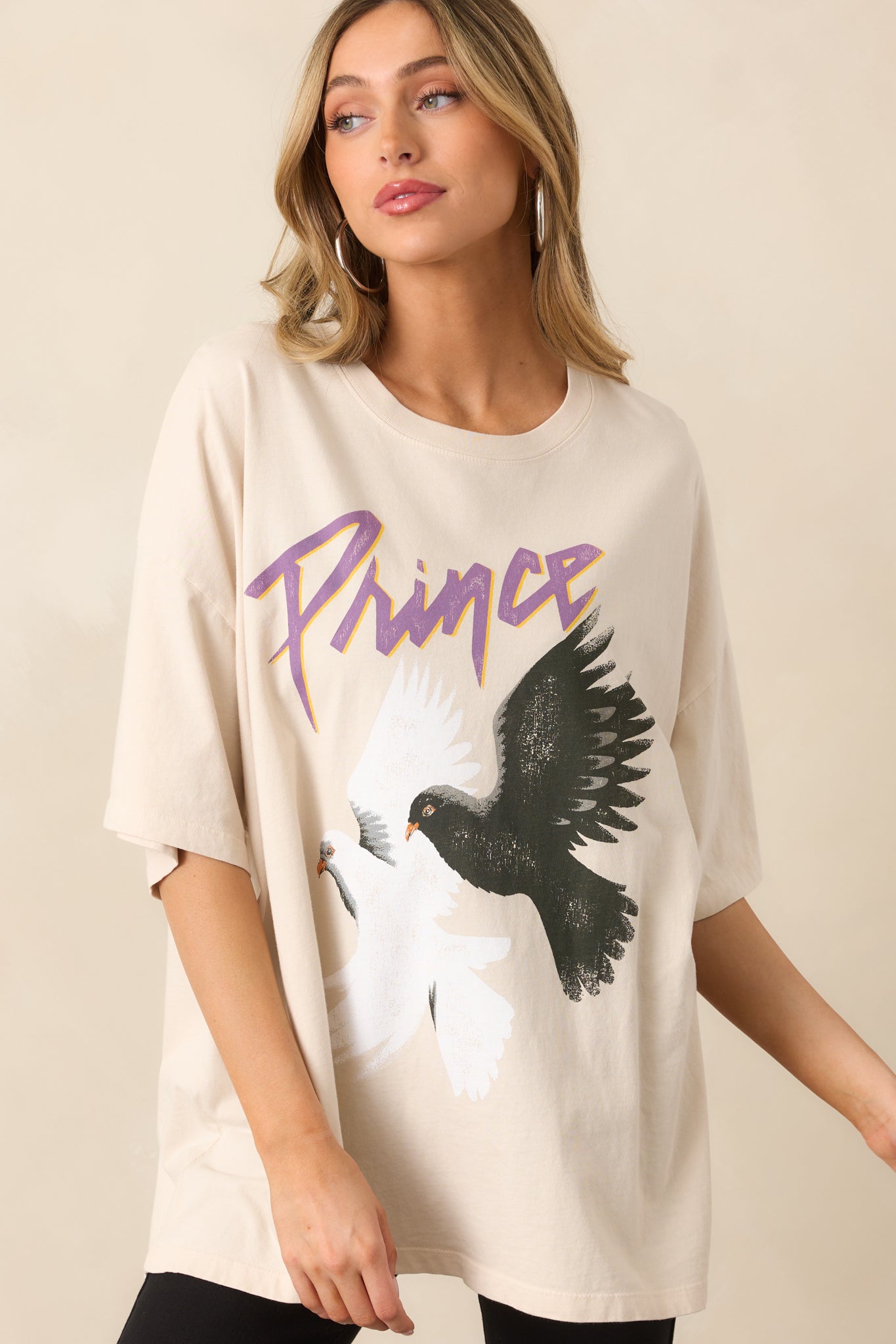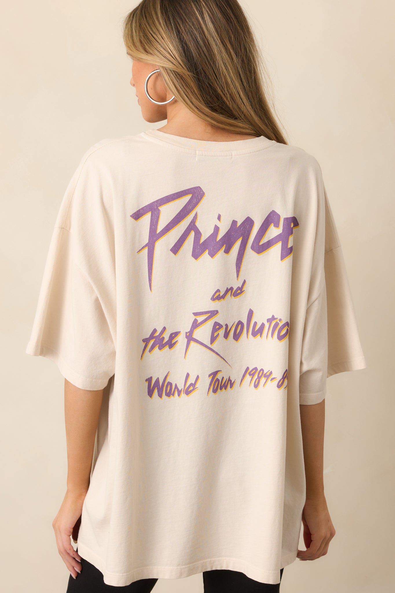 Rock your nostalgia with the Prince And The Revolution Ivory Oversized Tee. This cozy. relaxed-fit shirt lets you show off your love for iconic music while staying comfortable. Whether you're lounging at home. heading to a concert. or meeting friends for a casual handout. this tee adds a touch of retro flair too your look. This ivory Tee features a double dove graphic. the authentic 1984 world tour details. short sleeves. and a relaxed oversized fit.