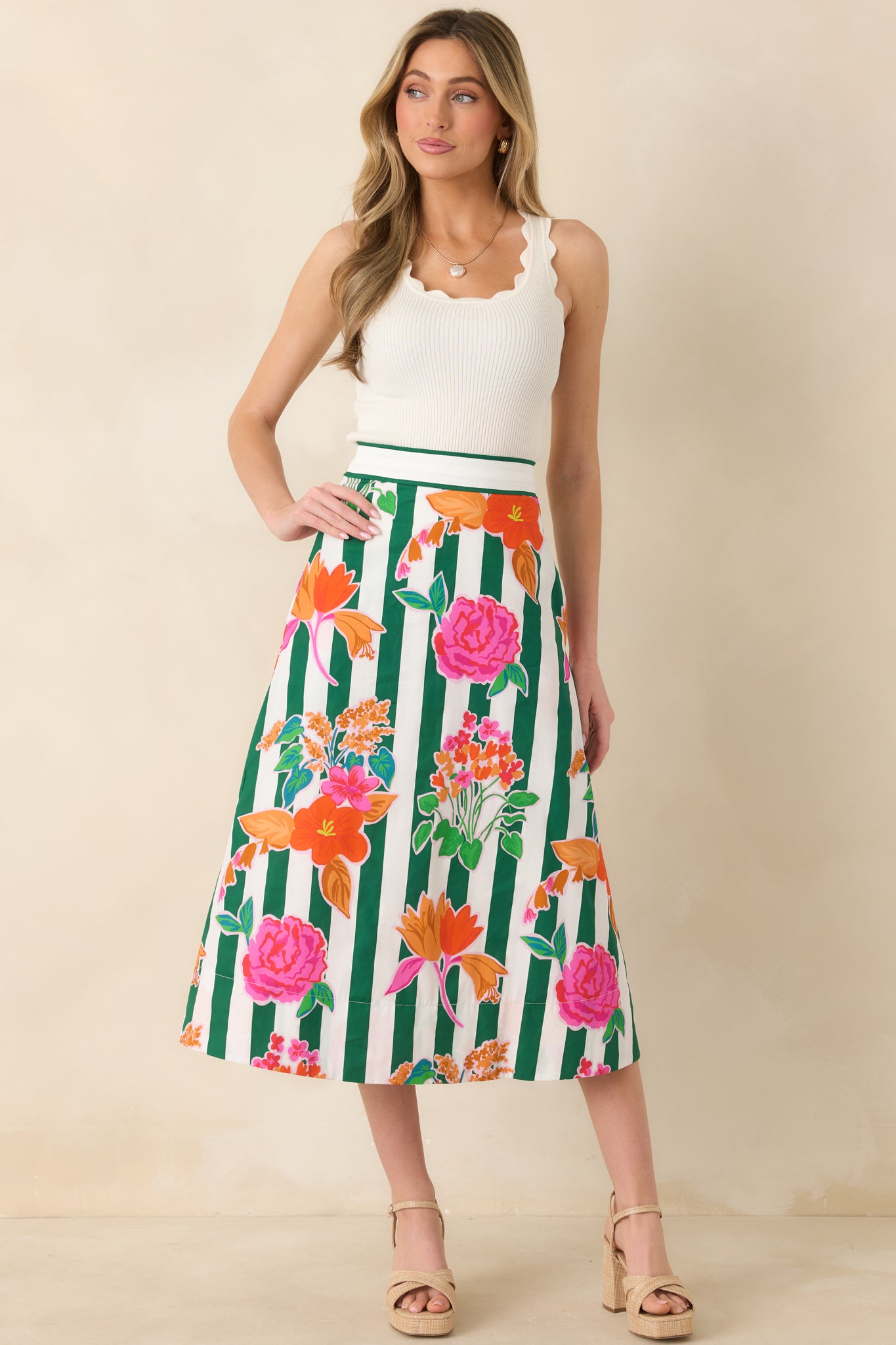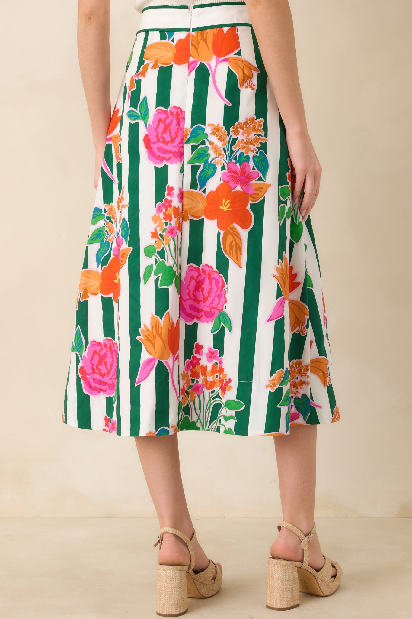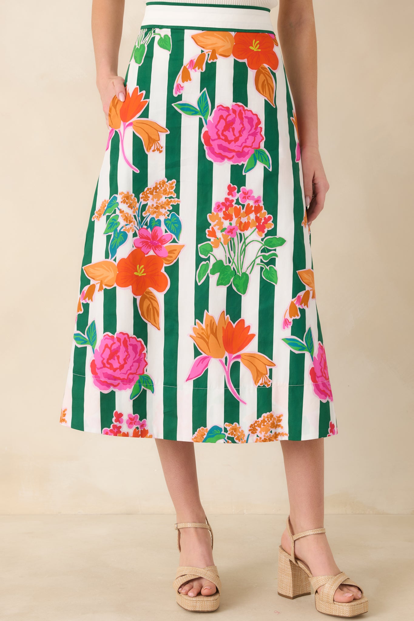 Fresh florals and classic stripes come together beautifully in the Prosperina Monroe Green Multi Floral Stripe Cotton Midi Skirt. Vibrant blooms pop against crisp green vertical stripes. creating a playful yet polished look. The high-waisted silhouette flatters the figure while the structured cotton fabric gives the skirt a graceful. easy drape. Perfect for pairing with fitted tanks. blouses. or lightweight sweaters. this versatile piece is ideal for brunch dates. vacations. and sunny day outings.
