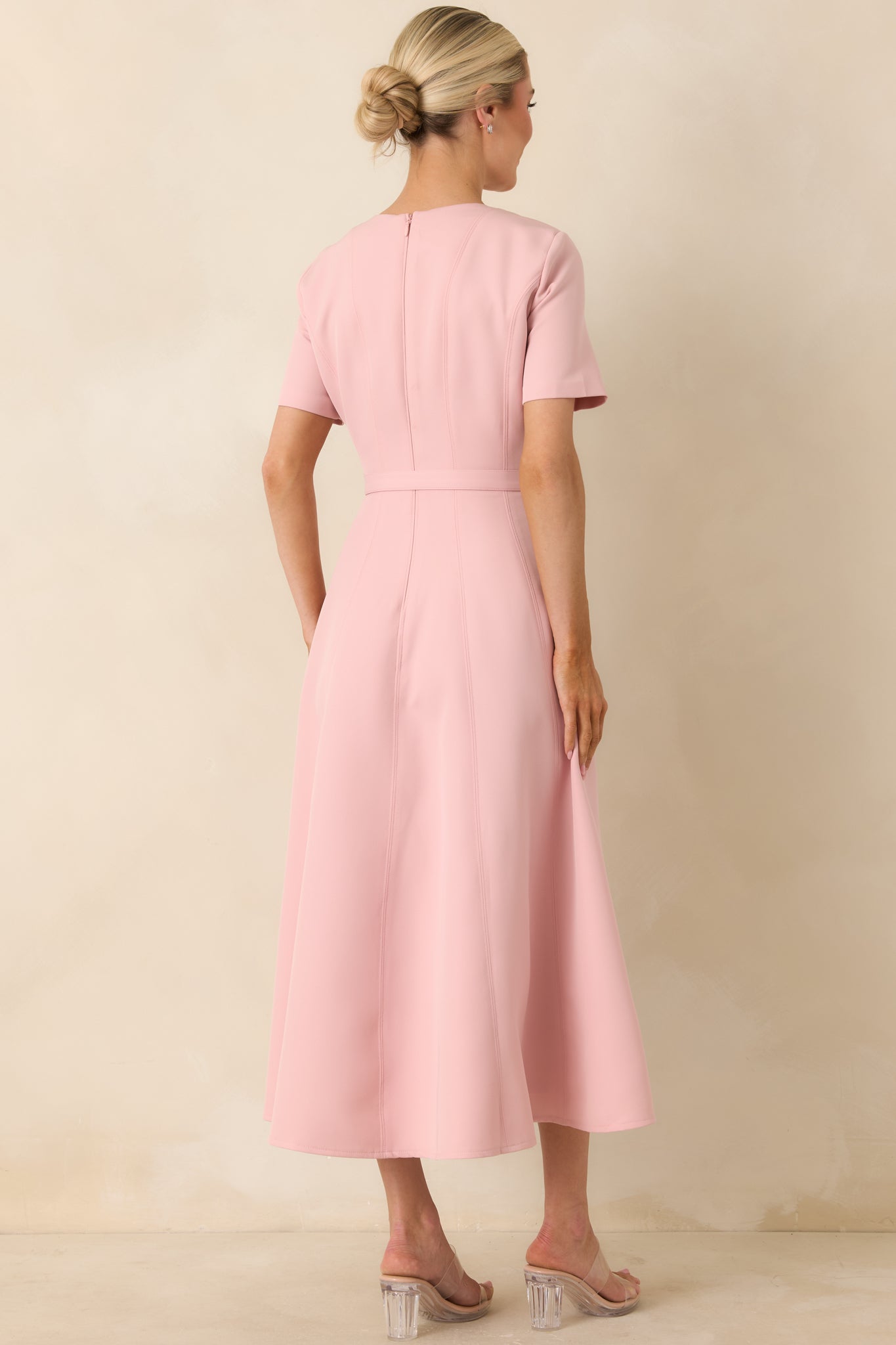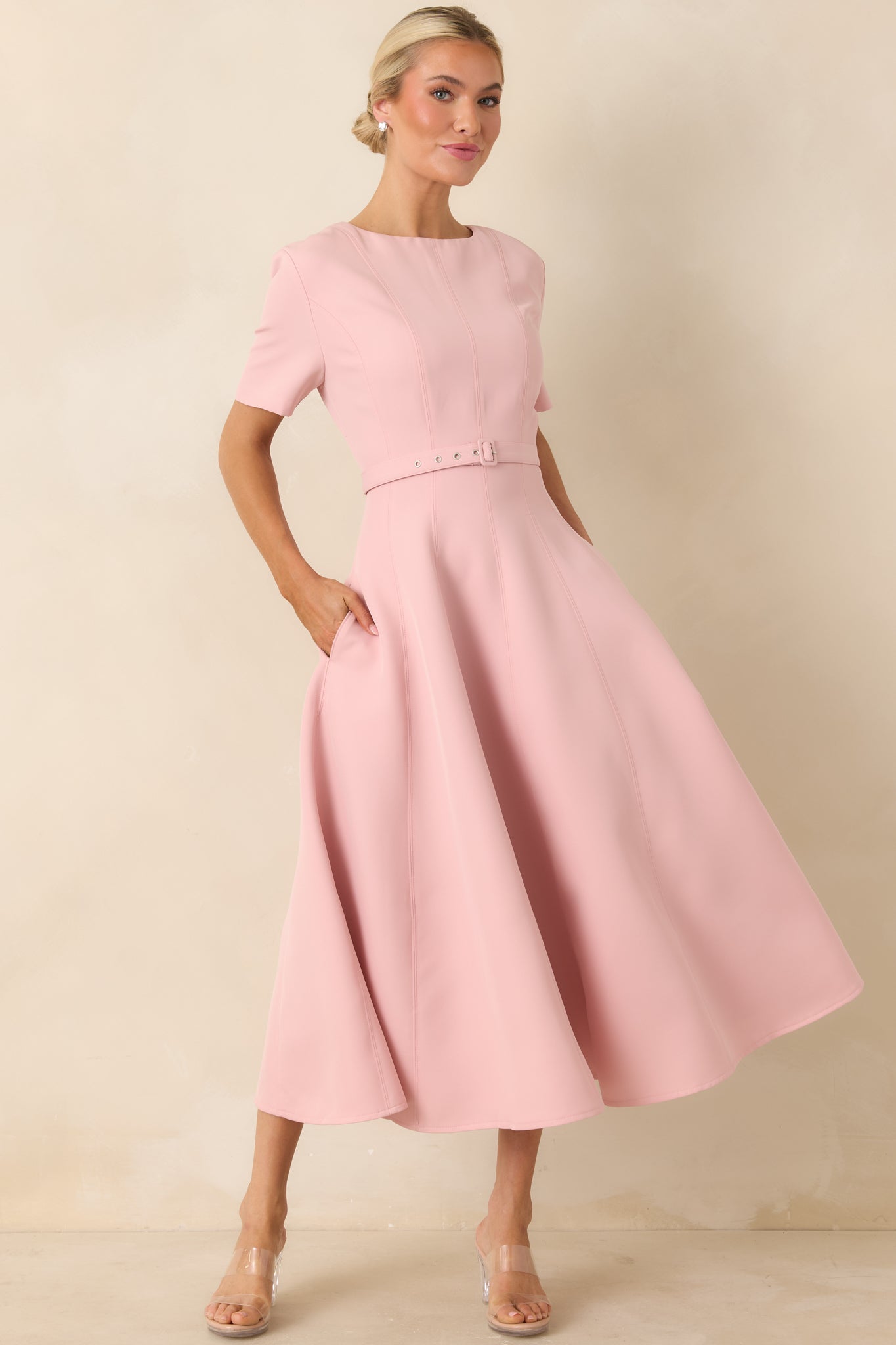 Polished. flattering. and effortlessly refined. the Put Together Perfectly Blush Pink Belted Midi Dress is designed for those moments when you want to look instantly put together. Featuring a soft blush pink hue. this dress offers a clean. minimal look with a feminine finish.