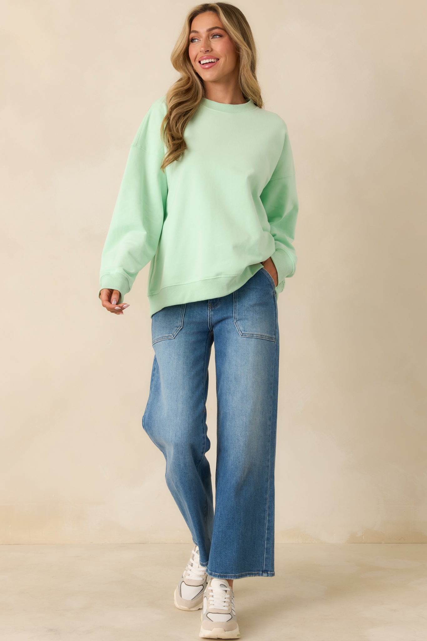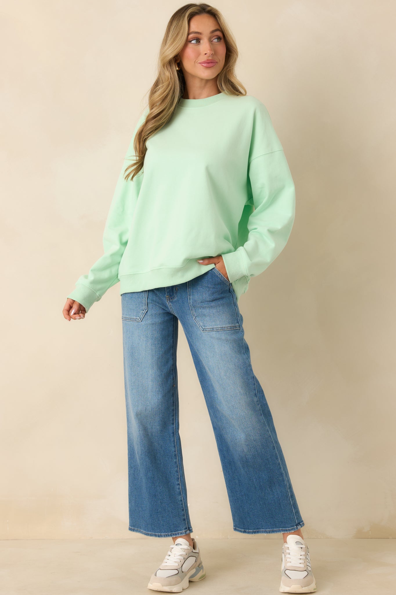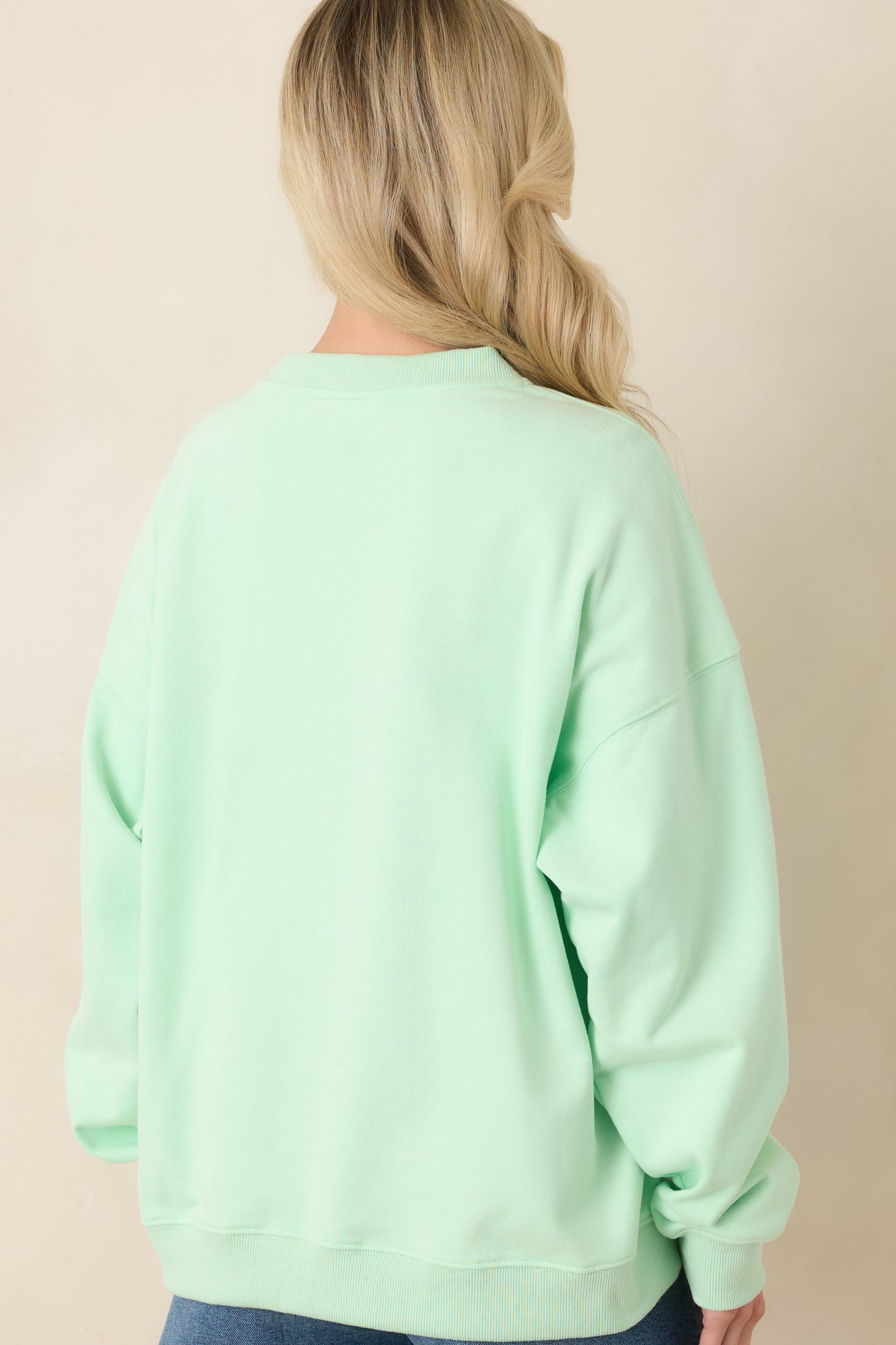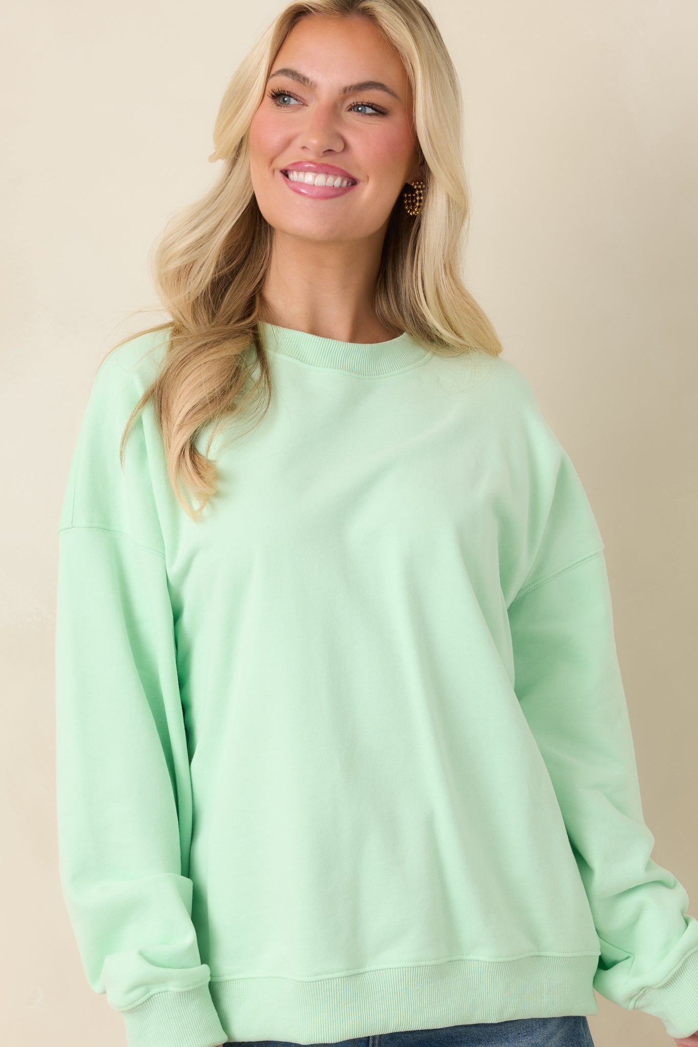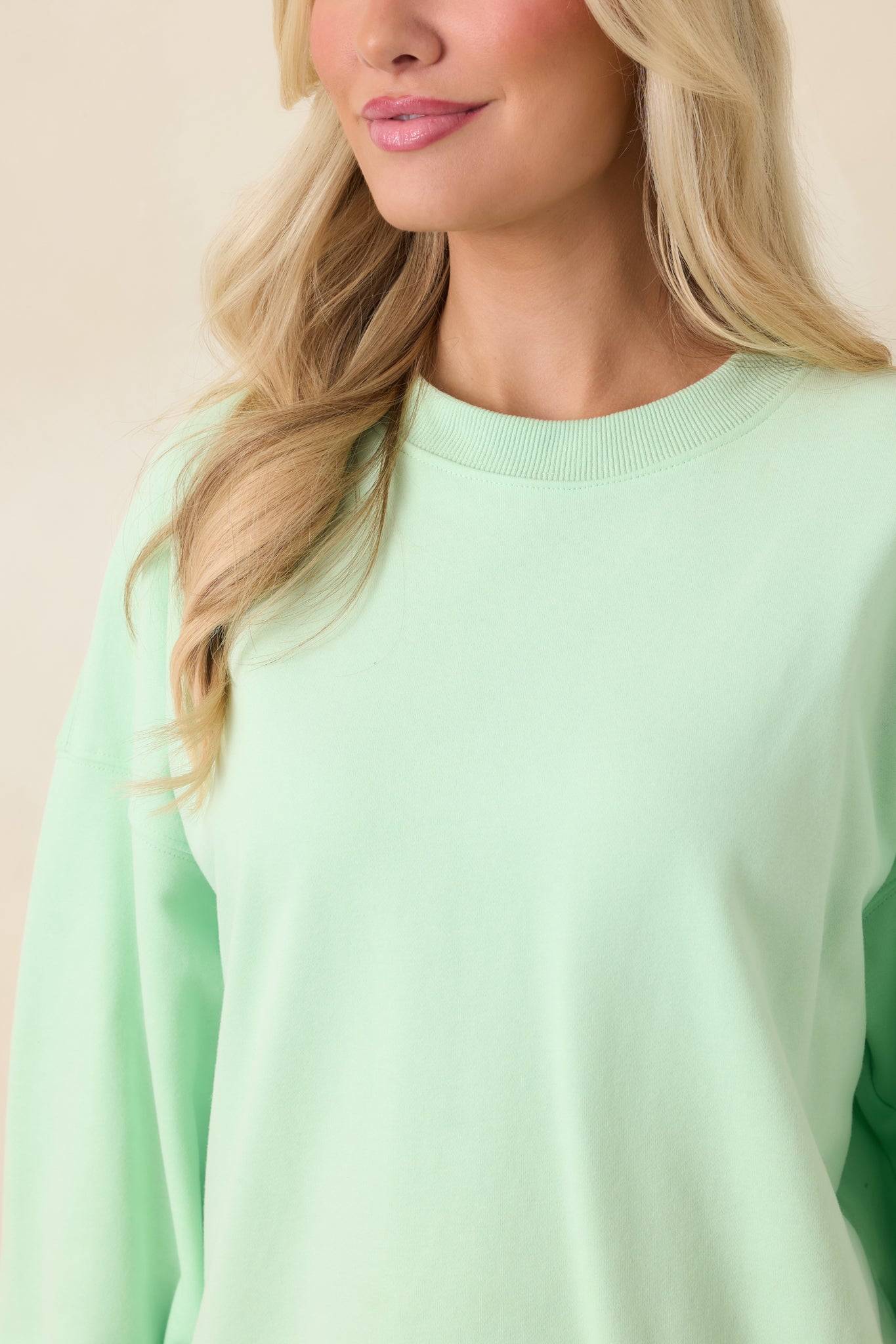 The Radiant Vibes Mint Green Crewneck Sweatshirt is exactly what it sounds like. This cool mint green crewneck brings an instant mood boost with a relaxed. easy fit that feels just right for everyday wear. It's the kind of sweatshirt that makes even low-key days feel a little brighter. This mint green crewneck sweatshirt features a soft knit fabric with a classic crew neckline. long sleeves. and ribbed trim at the cuffs and hem. Designed with a relaxed fit for comfortable wear and easy layering.