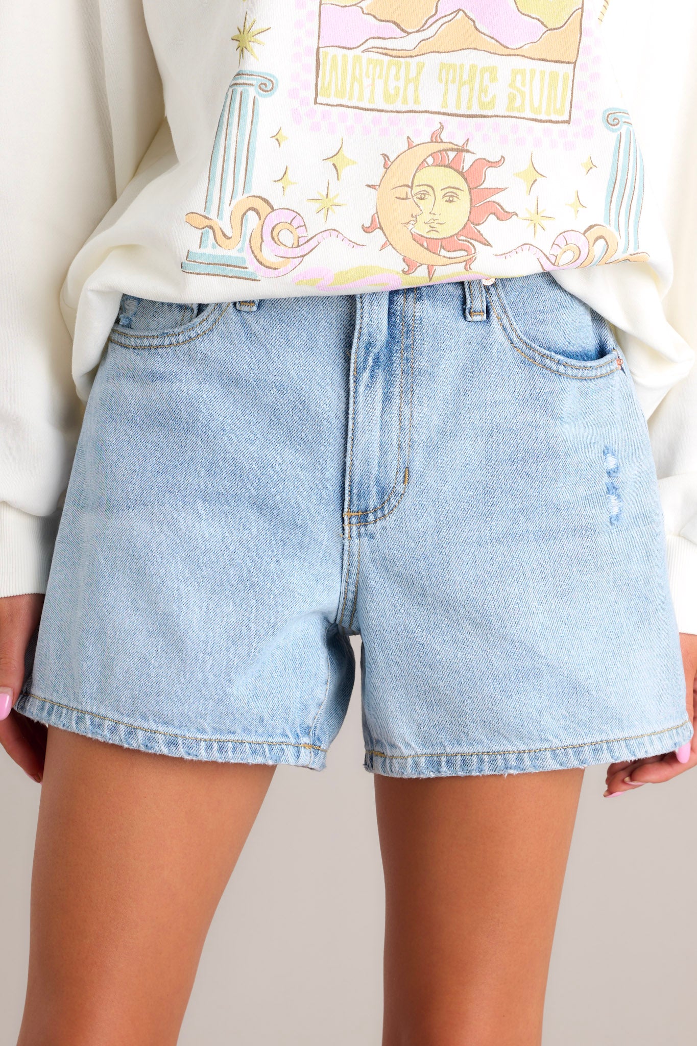 Add some retro flare to your wardrobe with our high rise denim shorts. The light wash brings a vintage touch to any outfit. Perfect for casual summer days or dressing up for a night out! These light wash denim shorts feature a high waist. classic button-zipper closure. functional belt loops. and five pockets.