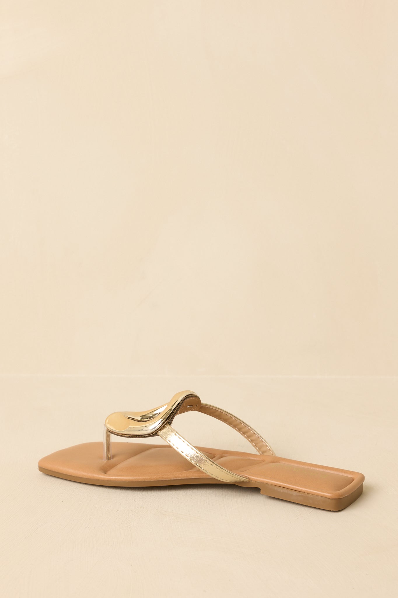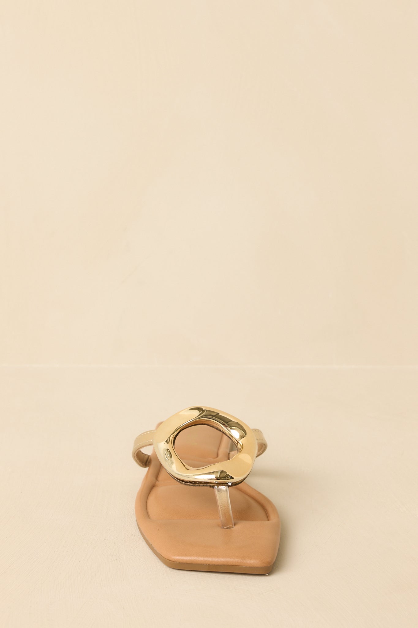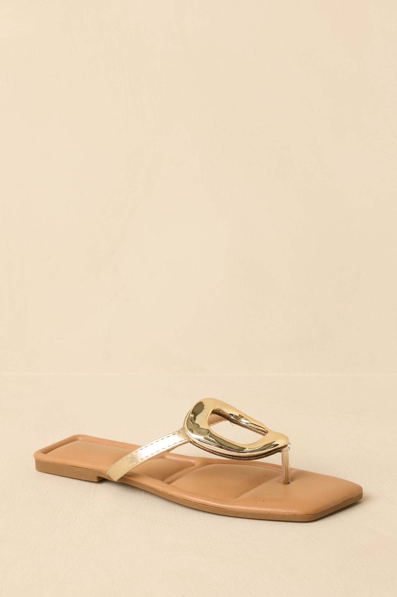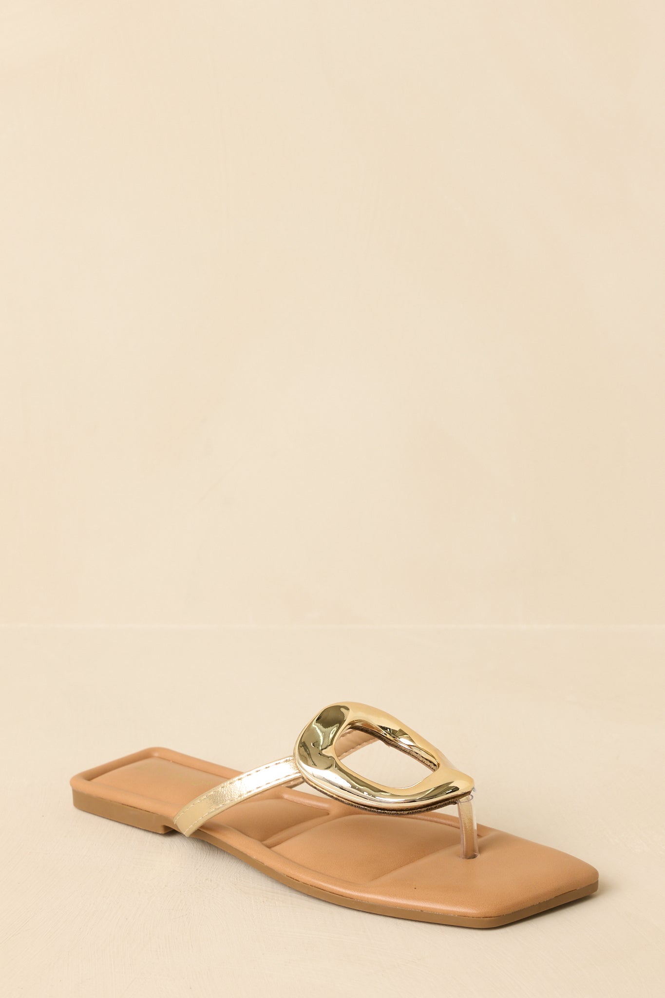 are pure sunshine in shoe form—bold yet refined. with a luminous finish that instantly elevates your look. The high-shine metallic strap and sculptural gold detail create a striking focal point. making these sandals perfect for days when your outfit calls for a little extra glow. These gold metallic flat thong sandals feature a square toe design with a metallic faux leather upper and statement gold-tone ring accent. Crafted with a cushioned footbed and slip-on construction. they sit atop a low stacked sole for a sleek. modern finish.