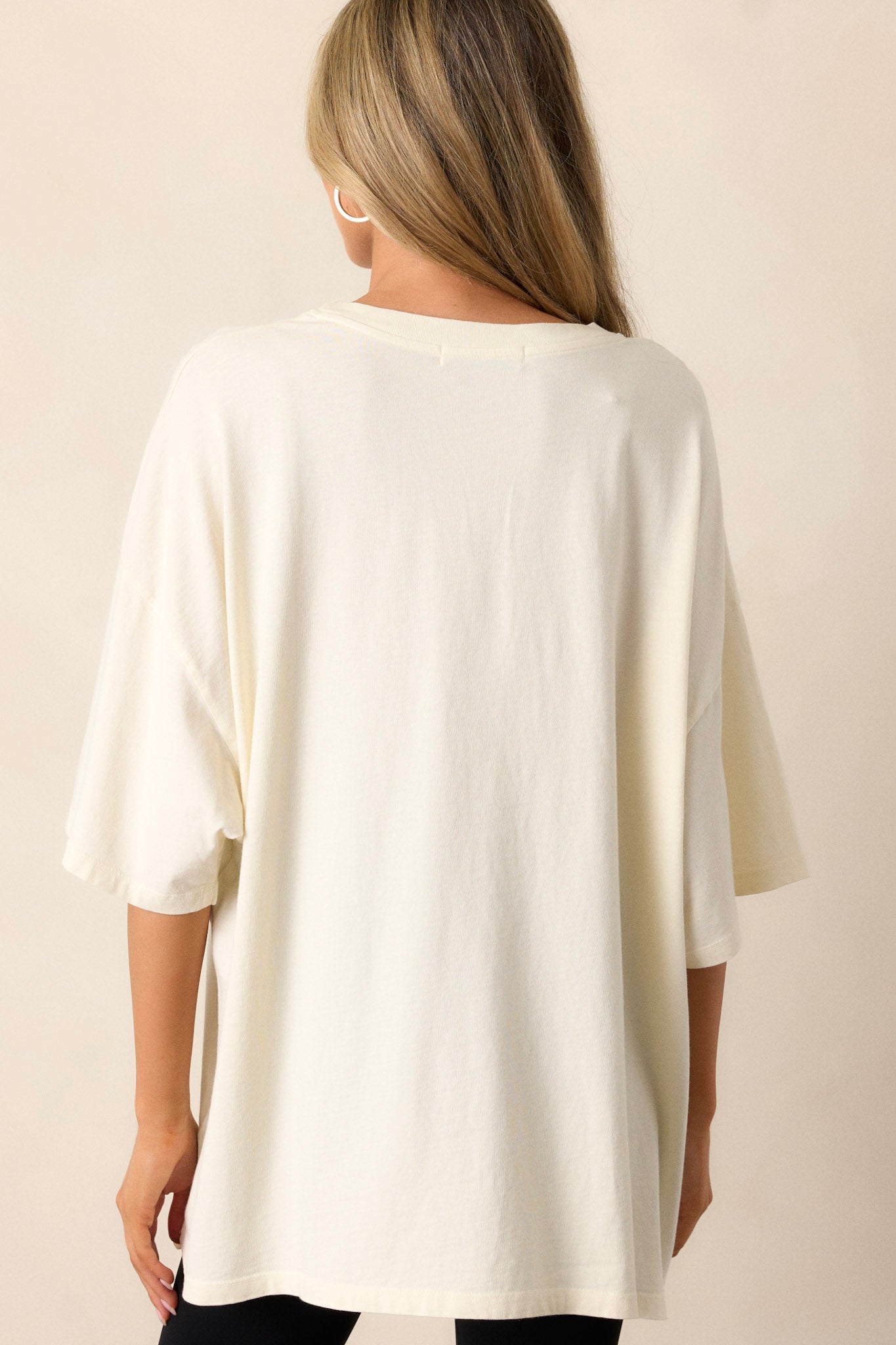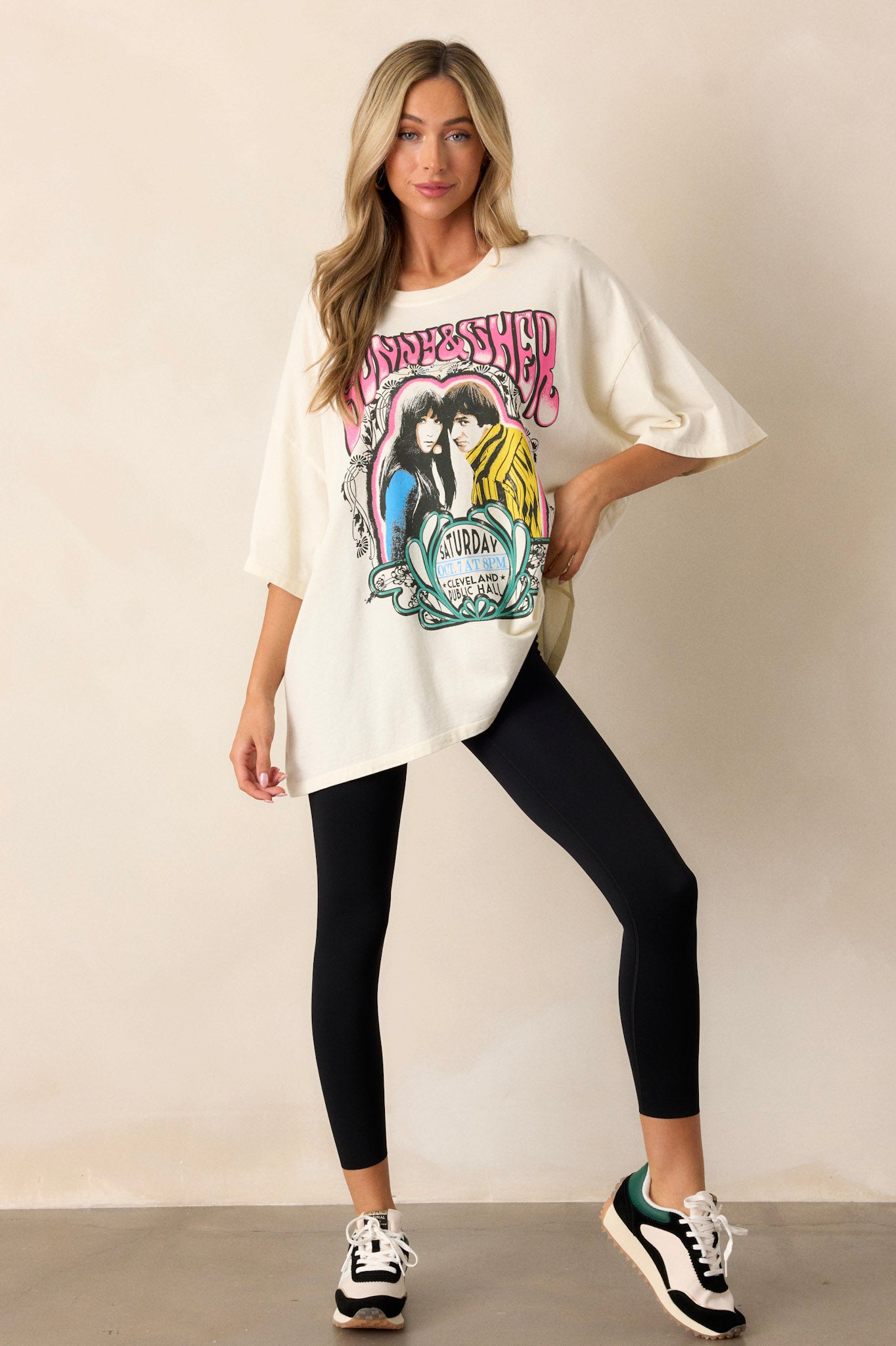 Bring back the iconic duo of Sonny & Cher in this exclusive Sonny & Cher Ivory Cleveland Public Hall Tee. With a vintage-inspired graphic. relive their greatest hits and inspire nostalgia in others. Limited edition and high-quality material for a one-of-a-kind shirt. Get yours before it's gone! This ivory tee features a graphic of "Sonny & Cher" with their Cleveland Public Hall show details. an oversized fit. and short sleeves.