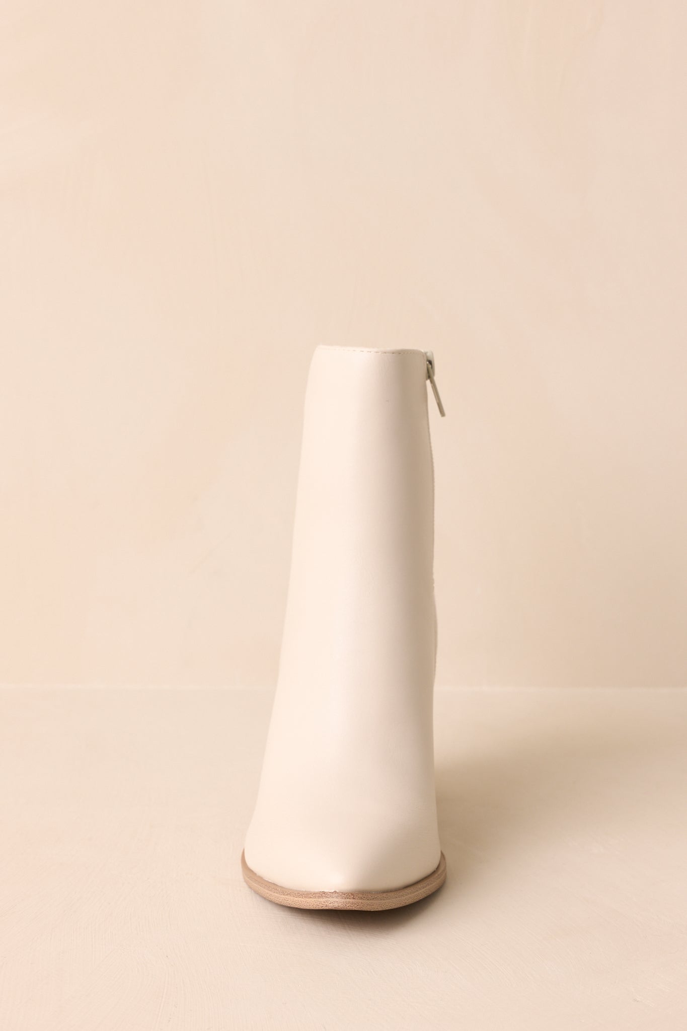 The Stand Corrected Ivory Faux Leather Suede Ankle Boots rewrite the rules with ease. a sleek update that makes every outfit feel sharp and intentional. These ivory ankle boots feature a smooth ivory faux leather front with tonal faux suede back panel. pointed toe. tan stacked block heel. inner side zipper closure. and a lightly cushioned insole.