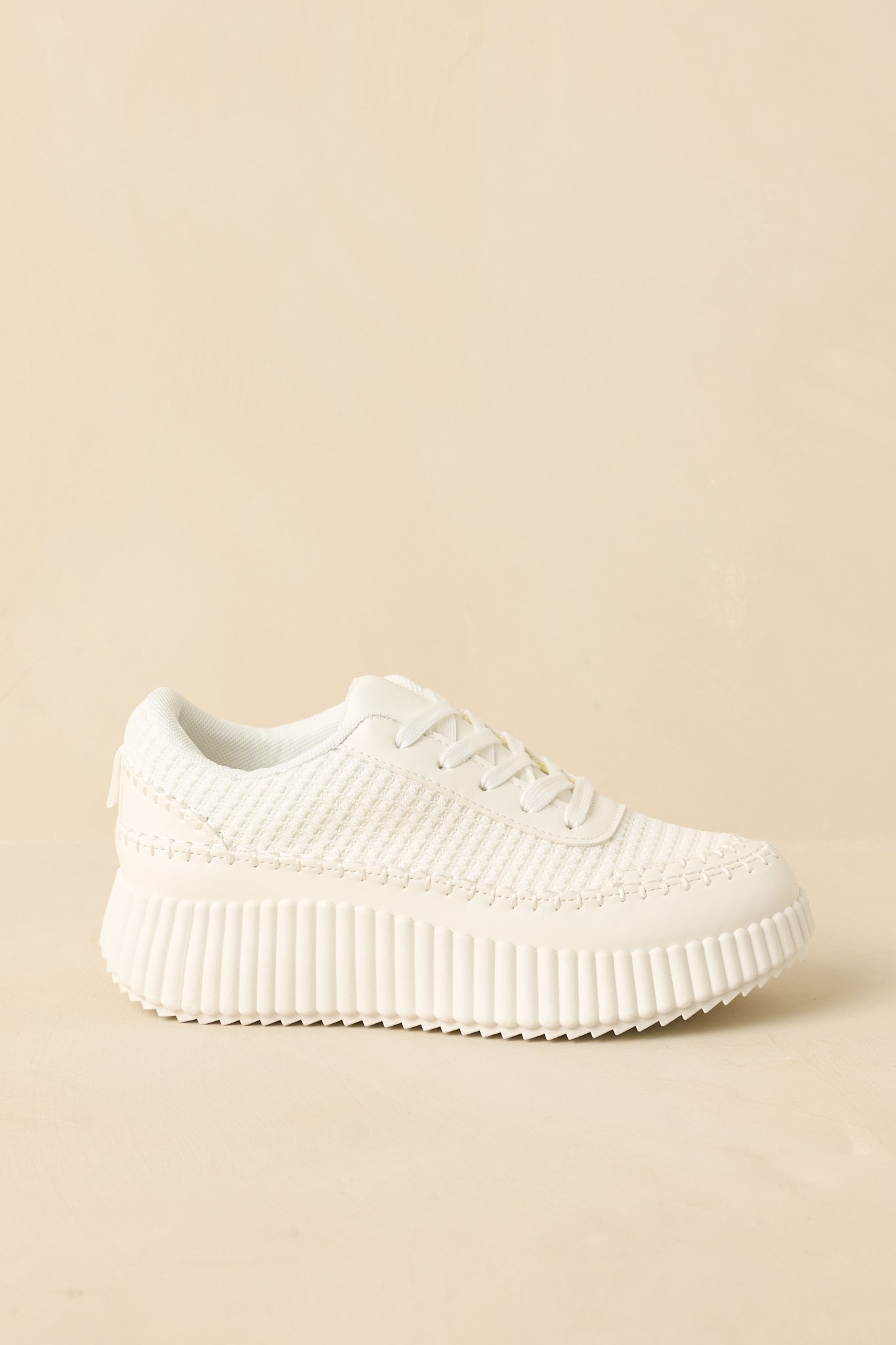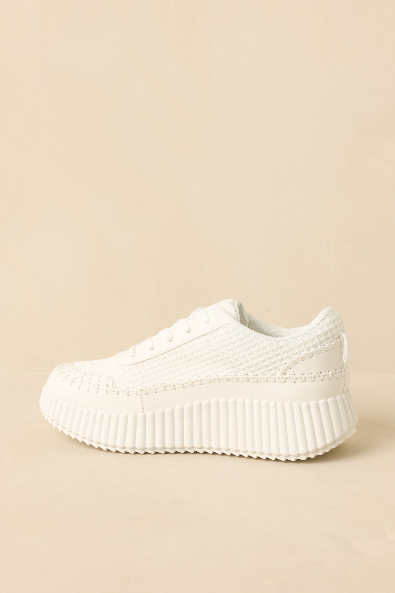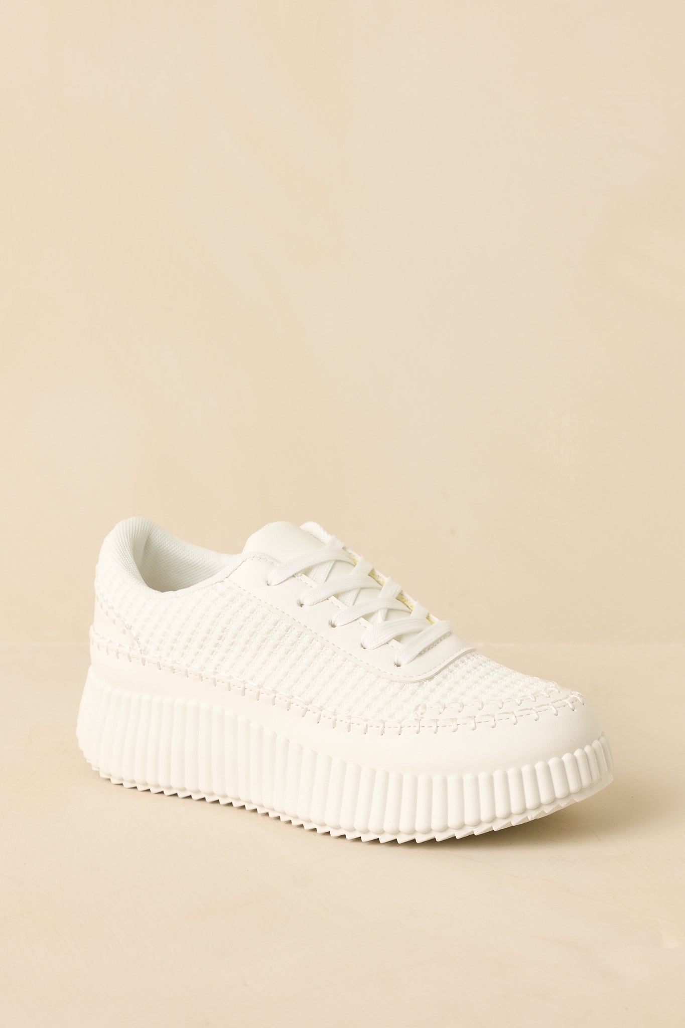The Step Into It White Textured Knit Platform Sneakers are the sneakers you reach for when comfort and style need to meet in the middle. Clean. modern. and quietly cool. they add a fresh finish to everything from athleisure sets to casual dresses. Easy to wear. easy to style. and just the right amount of elevated. These white sneakers feature a textured knit upper with a lace-up front for a secure fit. Designed with a chunky ribbed platform sole that adds subtle height while maintaining comfort. Finished with a cushioned interior and durable outsole for everyday wear.