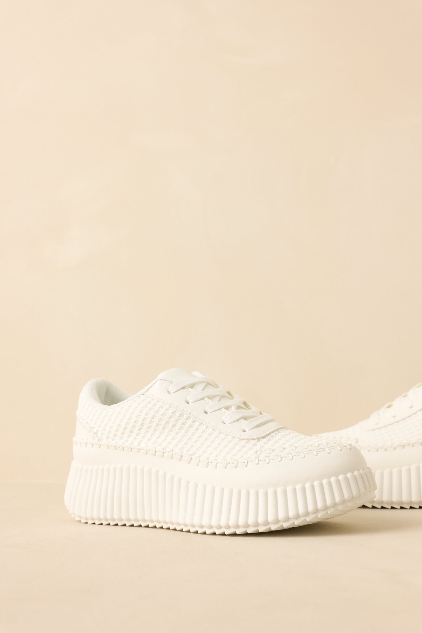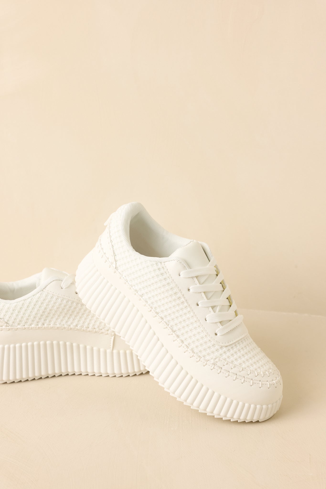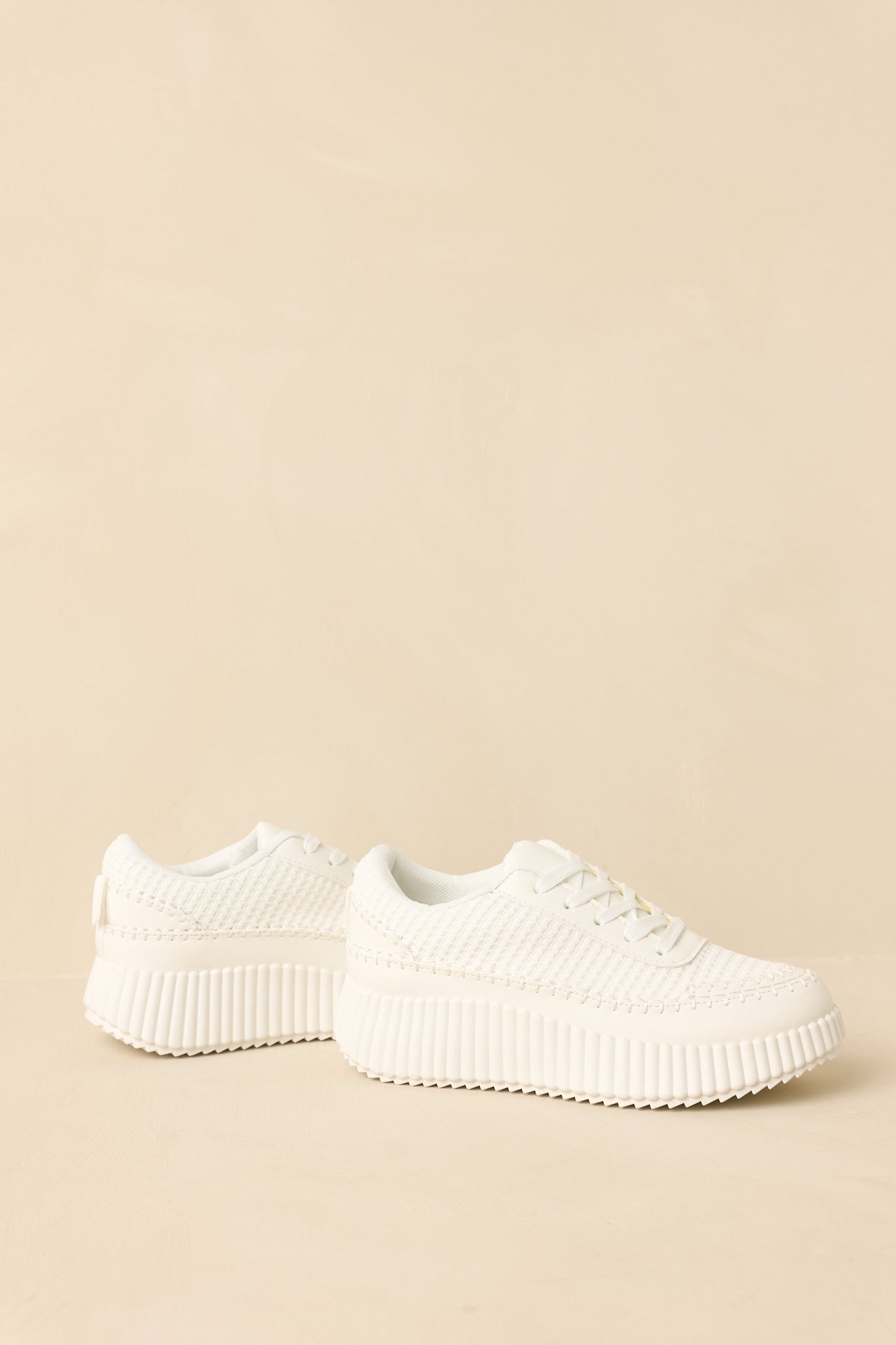 The Step Into It White Textured Knit Platform Sneakers are the sneakers you reach for when comfort and style need to meet in the middle. Clean. modern. and quietly cool. they add a fresh finish to everything from athleisure sets to casual dresses. Easy to wear. easy to style. and just the right amount of elevated. These white sneakers feature a textured knit upper with a lace-up front for a secure fit. Designed with a chunky ribbed platform sole that adds subtle height while maintaining comfort. Finished with a cushioned interior and durable outsole for everyday wear.