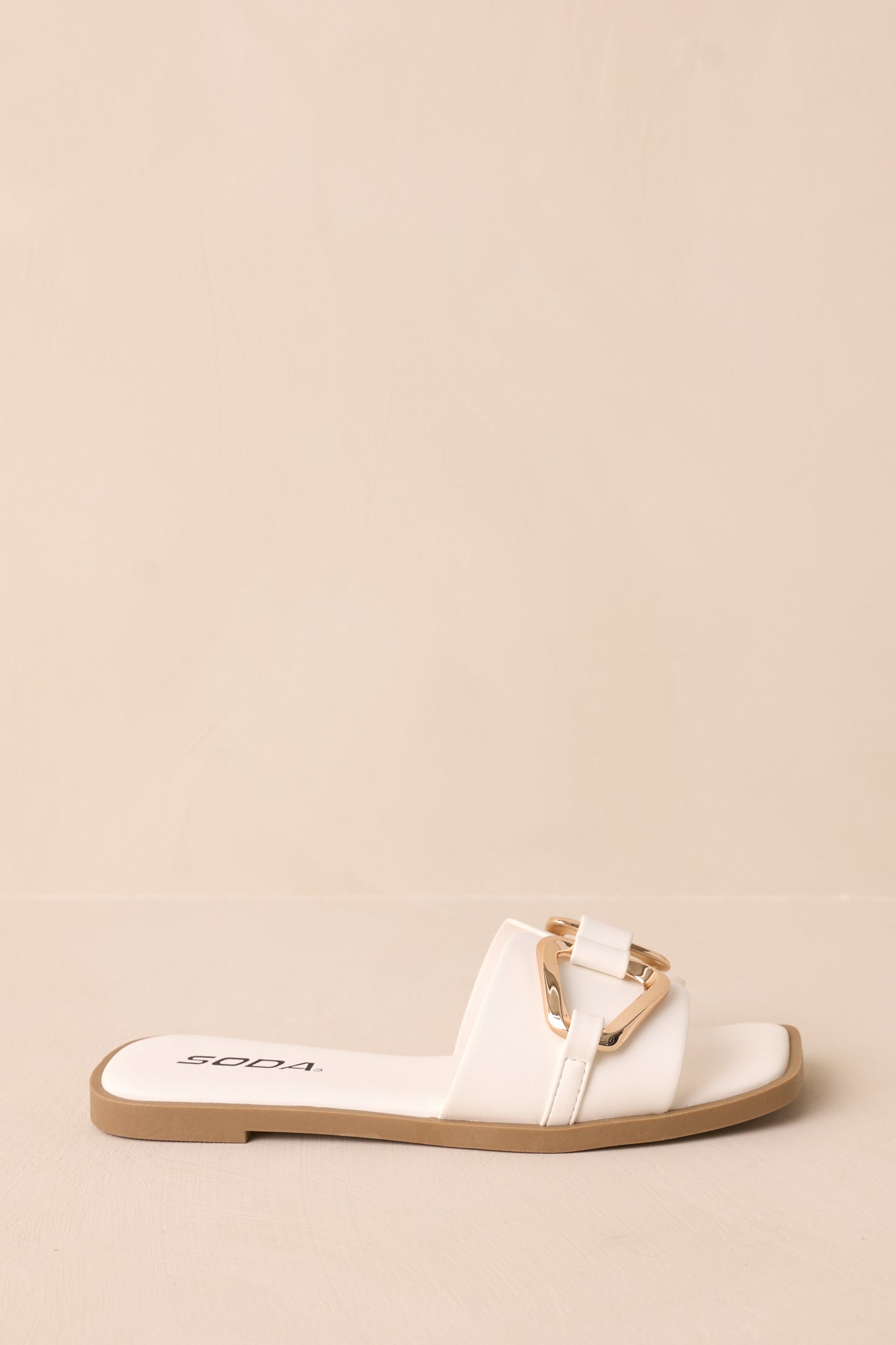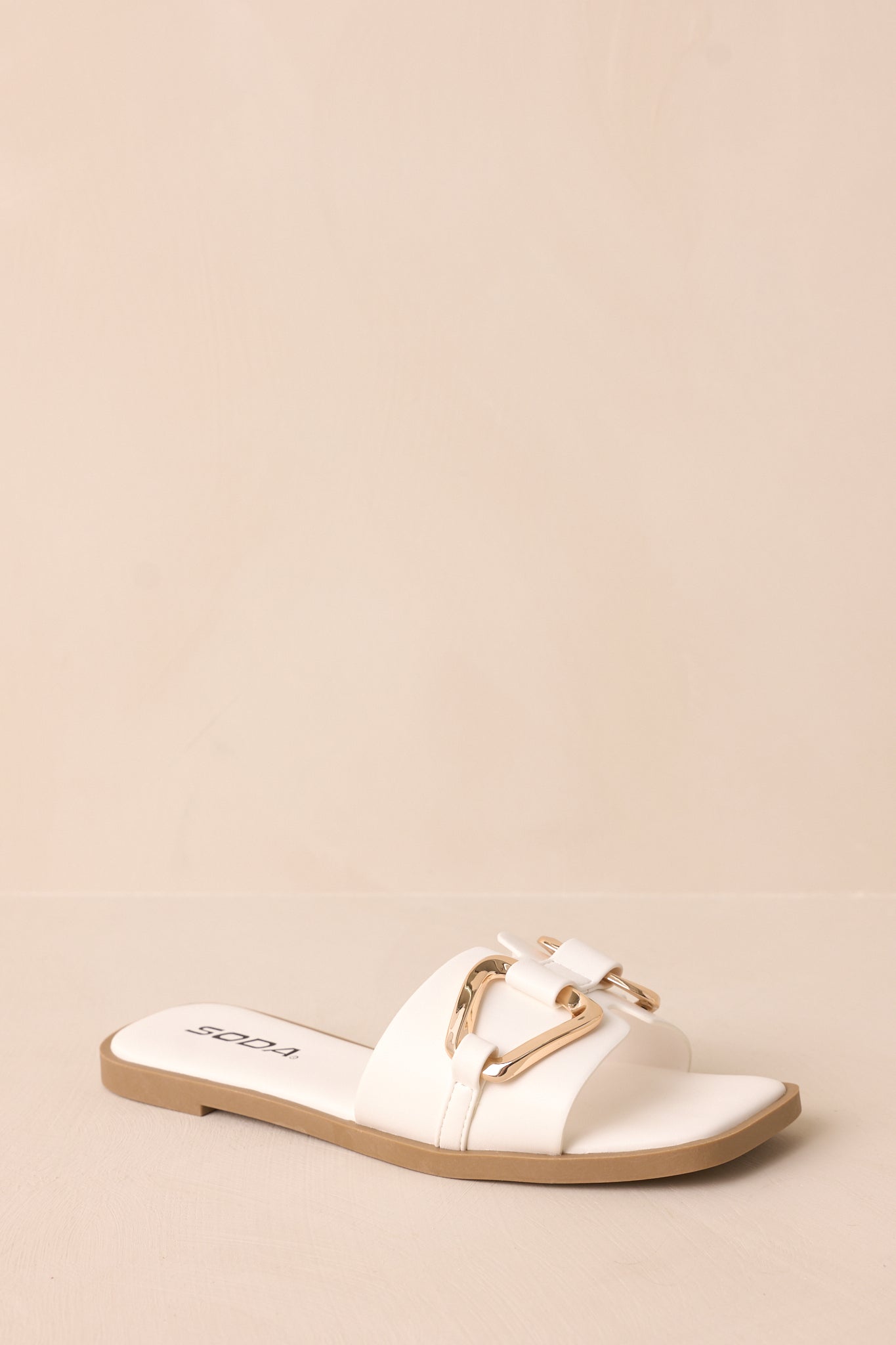 Upgrade your summer sandal game with our Stepping Stones White & Gold Sandals. These stylish sandals feature a white strap for a touch of glam. Perfect for any occasion. these sandals will add a chic and trendy touch to any outfit. Walk with confidence and style in these comfortable and versatile sandals. These white & gold sandals feature a square toe. notched band. a slip-on design. gold buckle hardware and a cushioned sole.