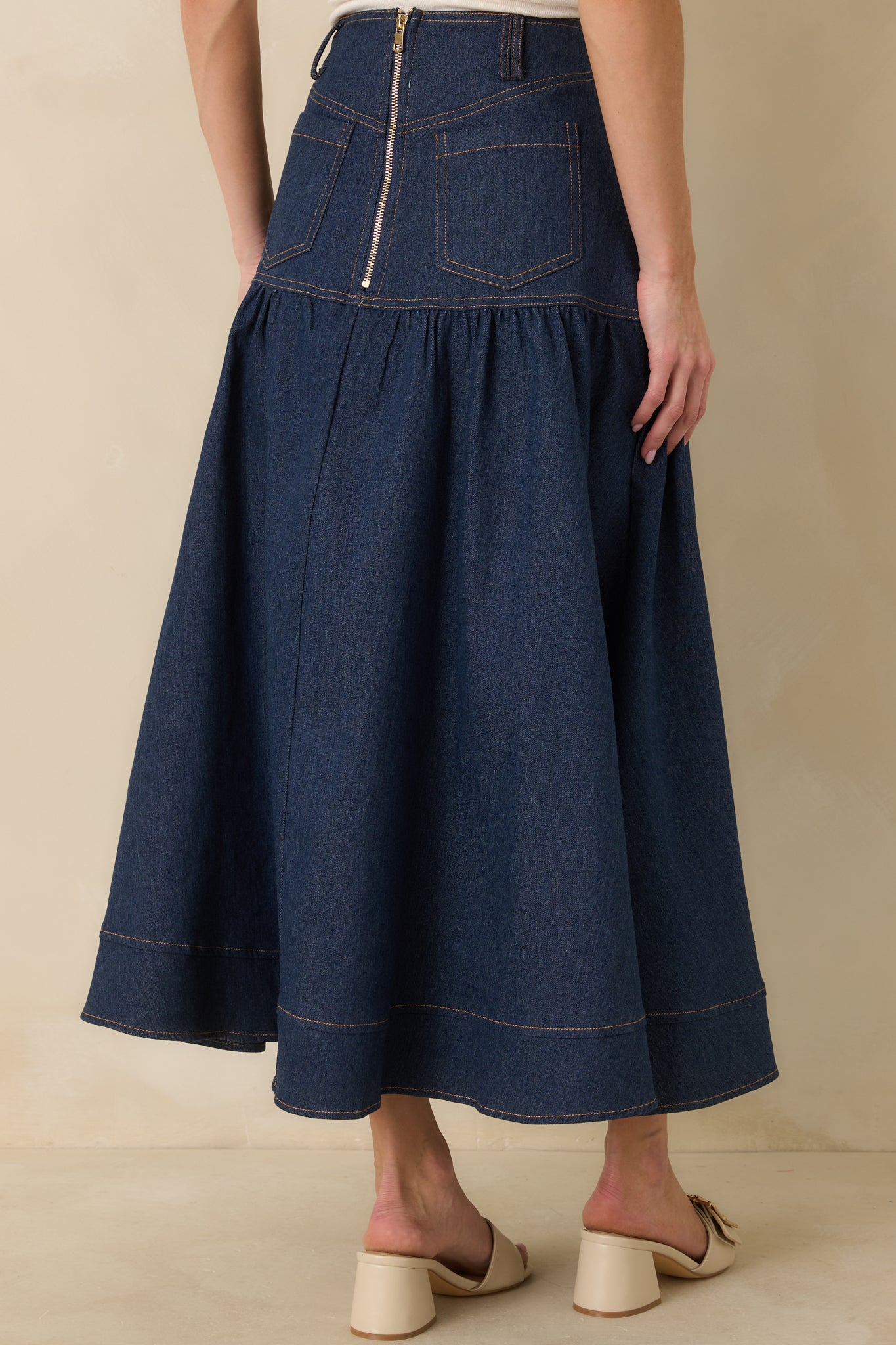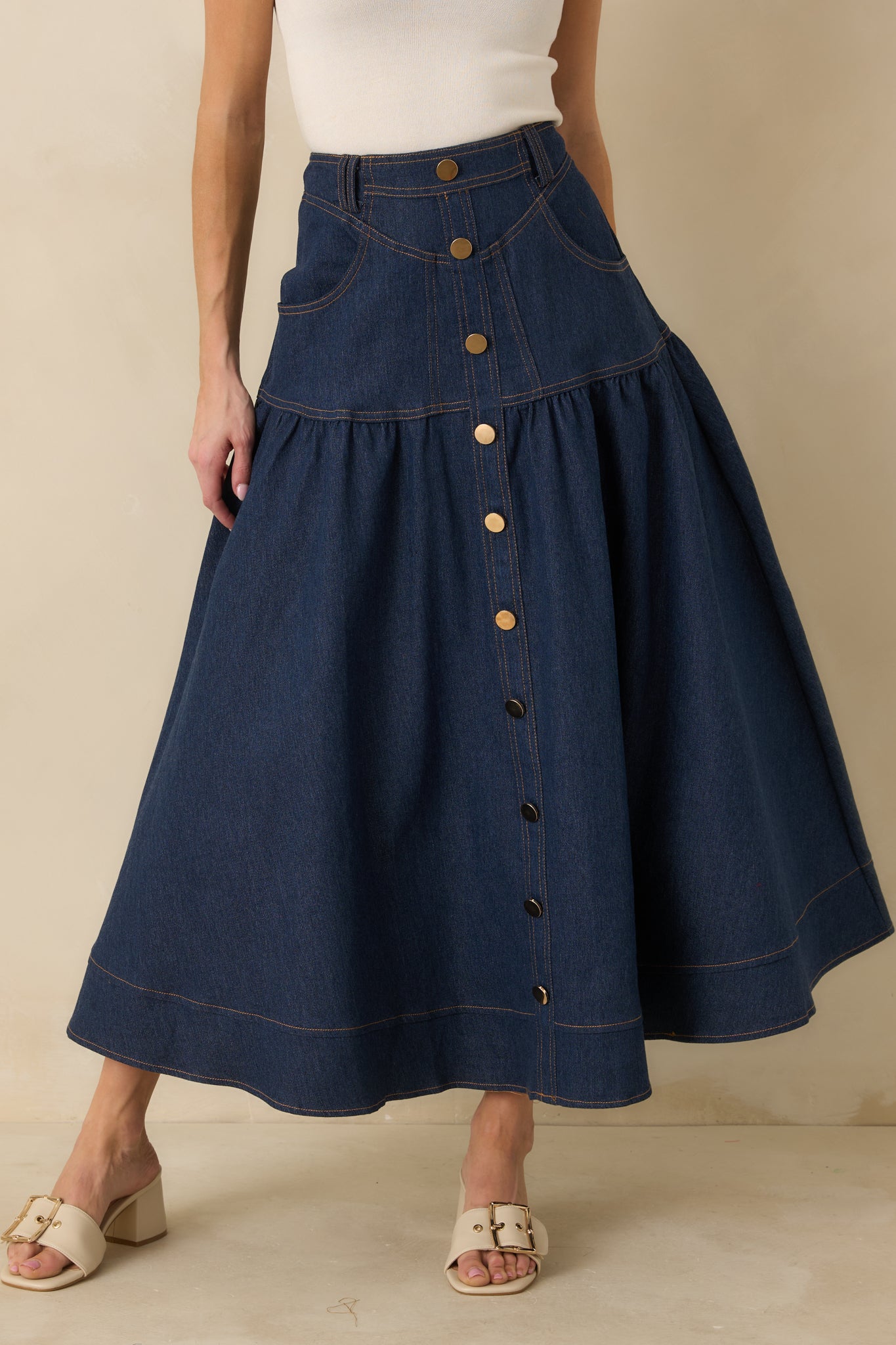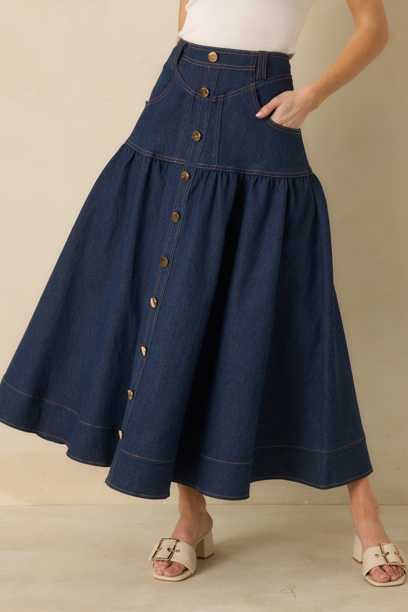 The Town & Country Dark Wash Denim Button-Down Maxi Skirt is a refined take on a forever classic. Designed with clean lines and thoughtful tailoring. this piece blends everyday ease with unmistakable polish. The rich dark wash elevates the denim. while the button-down front and subtle volume through the skirt create graceful movement with every step. Finished with a high-rise fit and elegant details. it's the kind of staple that feels equally at home dressed up with a blouse or styled casually with a simple tee—timeless. confident. and effortlessly chic. This dark wash denim maxi skirt features a flattering high-rise waist. button-down front closure with gold-tone buttons. and a softly flared silhouette. Designed with front and back pockets. contrast topstitching. and a structured waistband for a tailored fit. The skirt is finished with a back zipper closure. belt loops. and a wide hem for added polish and movement.