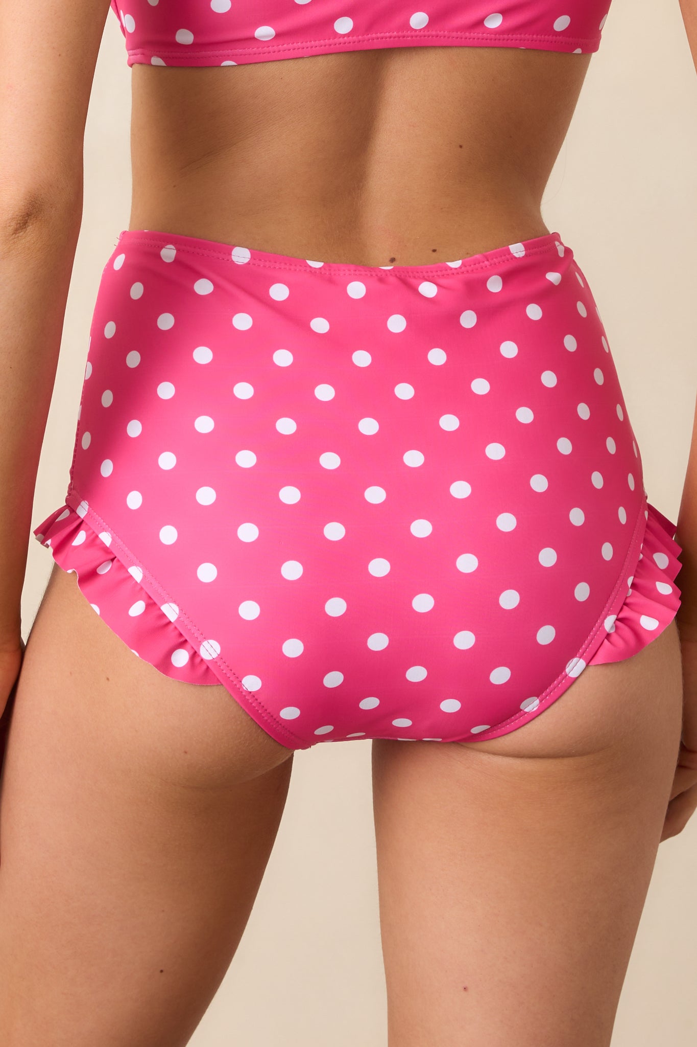 The Under The Sun Pink Polka Dot High-Waisted Ruffle Trim Bikini Bottoms are a delightful choice for soaking up the warmth and joy of a sunny day. They're perfect for those carefree moments when you want to feel playful and radiant. These pink bikini bottoms feature a white polka dot print. high rise design. ruffle trim on the bottom hems. a full coverage back. and front panel design.