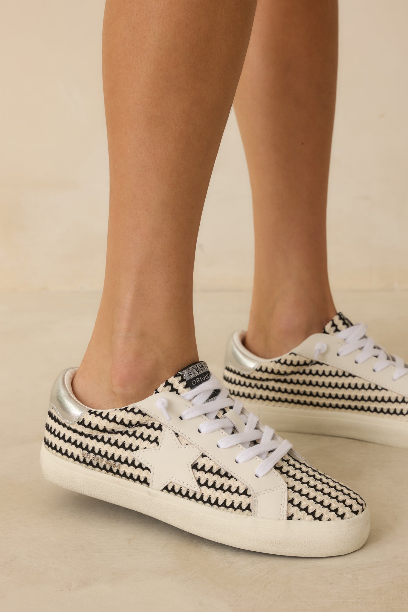 Step up your sneaker game with the Vintage Havana Flair 45 black and white crochet sneakers! These stylish kicks feature a unique crochet design that adds a touch of flair to your outfit. With a comfortable fit and trendy look. these sneakers are perfect for those who want to make a statement. These black and white shoes feature a rounded toe. no-tie laces. replacement laces. star detailing . and a thick sole.