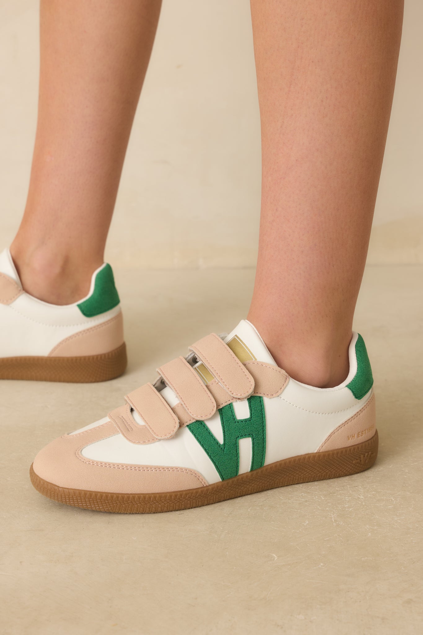 The Vintage Havana Pace 5 Green Multi Three Strap Low Top Sneakers keep off-duty style feeling current. a sporty-casual pair with a playful. street-chic edge. These low-top sneakers feature a smooth ivory faux leather upper with beige faux suede details. three beige Velcro strap closures. a green faux suede side logo appliqué. green suede heel tab. gold logo detail on the tongue. and a classic brown rubber outsole with textured tread.
