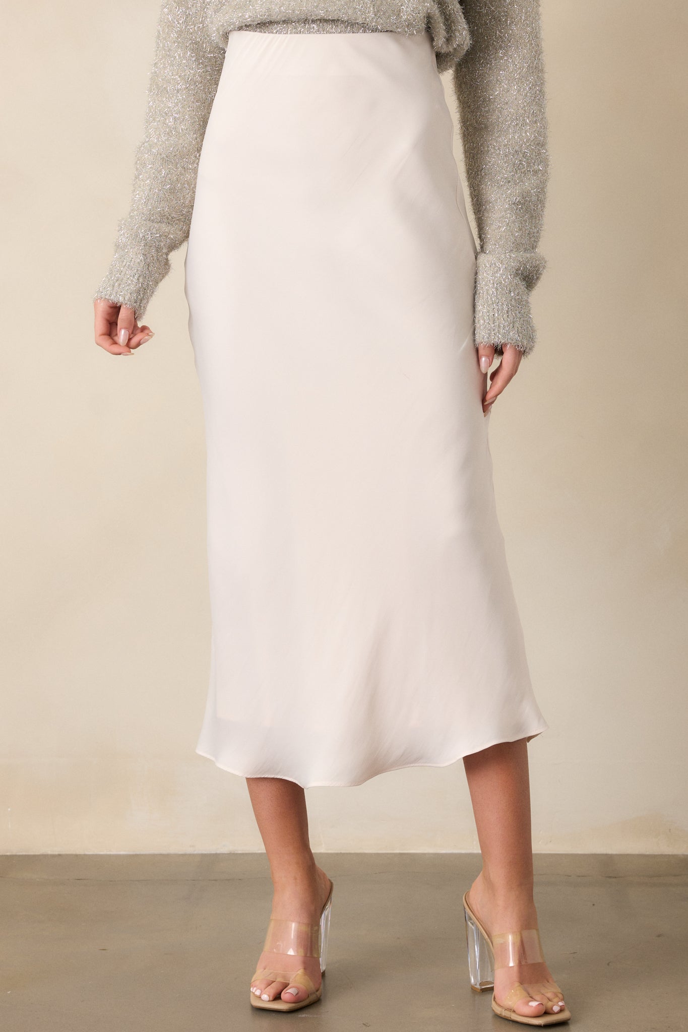 Get ready for a night out with our Z Supply Europa Luxe Sheen Midi Skirt. This skirt will give you a sophisticated and elegant look. The midi length adds a touch of versatility. making it perfect for any occasion. Show off your style and embrace timeless beauty with this stunning skirt. This ivory skirt features an elastic waistband. mid rise. satin fabric. and maxi length.