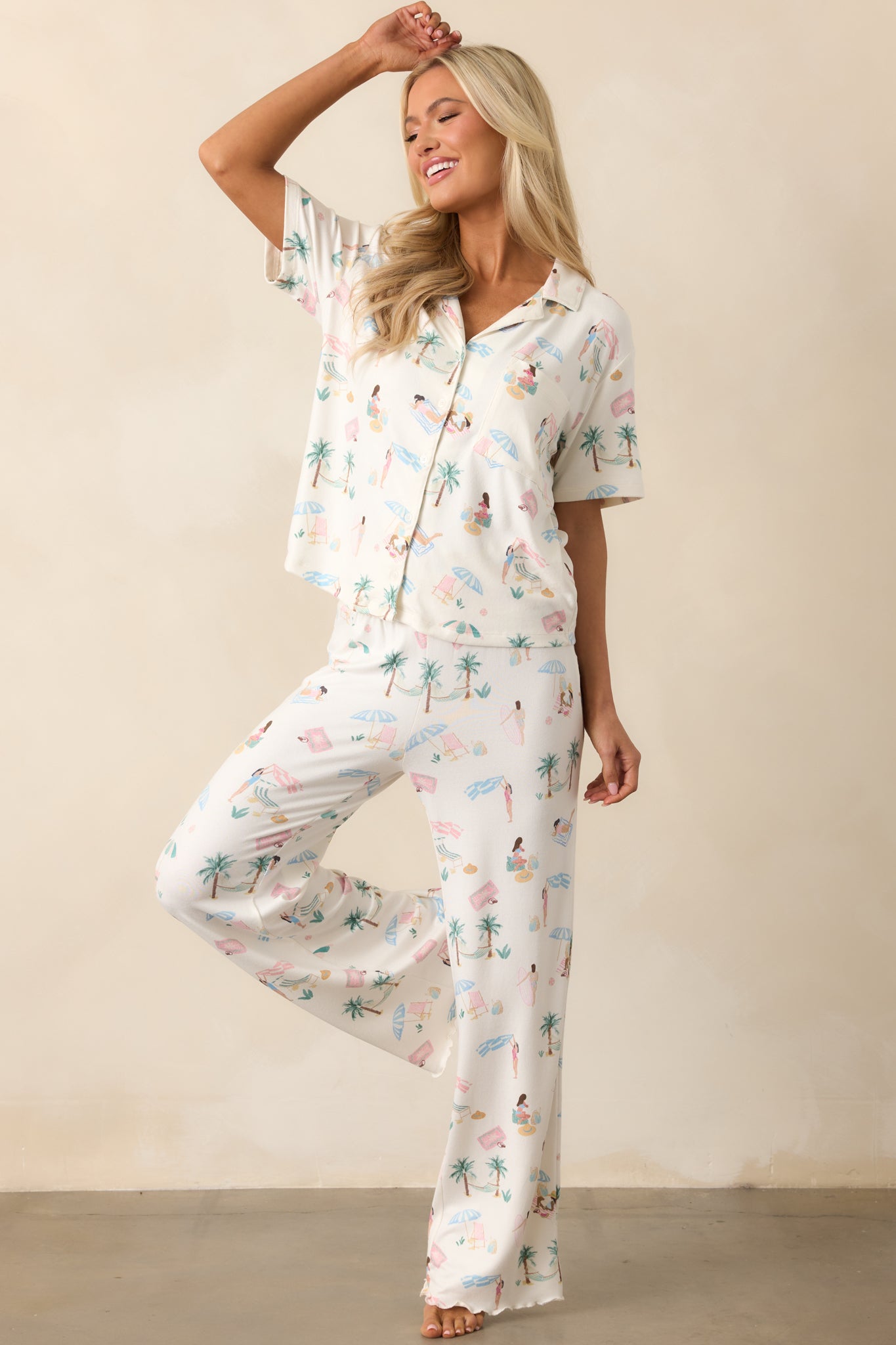 The Z Supply Ivory Bone Beach Days Pajama Top is a cozy choice for capturing the relaxed essence of a seaside escape. Its soft design makes it perfect for lounging in comfort. whether by the ocean or in the quiet of your own space. This ivory pajama top features an ultra-soft jersey fabric. a collared neckline with notch lapels. functional button front. functional breast pocket. short sleeves. and overall beach print.