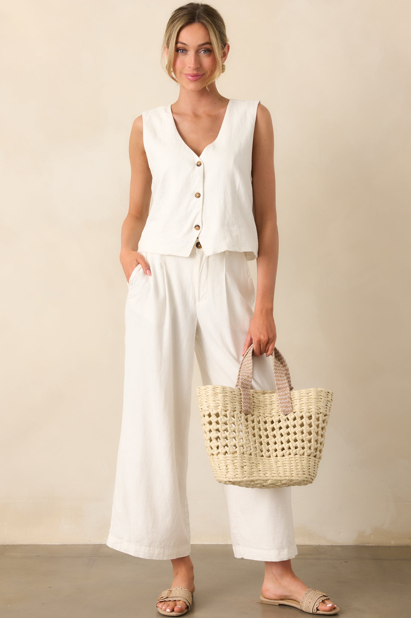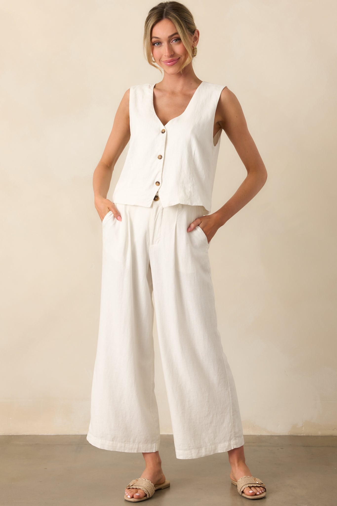The Z Supply White Marta Linen Vest brings an easygoing charm to your routine. Whether layered or worn solo. it adds a touch of effortlessness to your lineup. This white vest features a lightweight linen fabric. functional button front. tortoise shell buttons. sleeveless design. relaxed fit. and slightly cropped length.